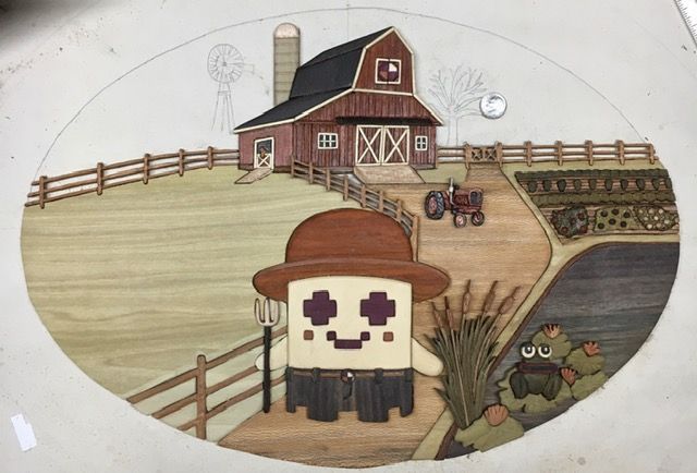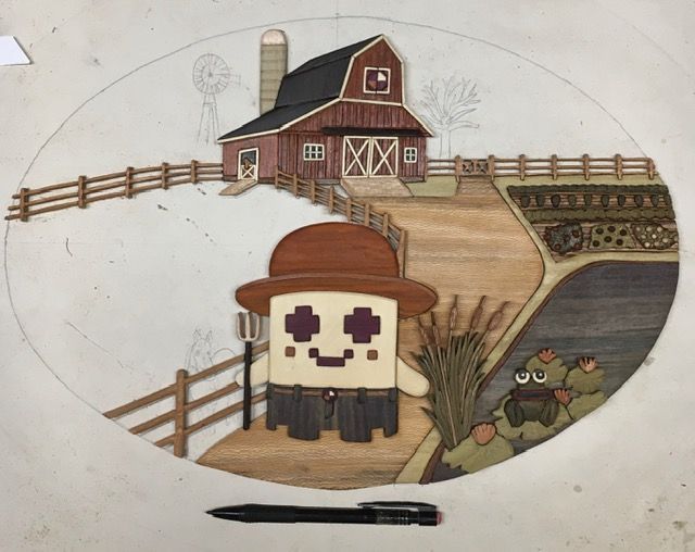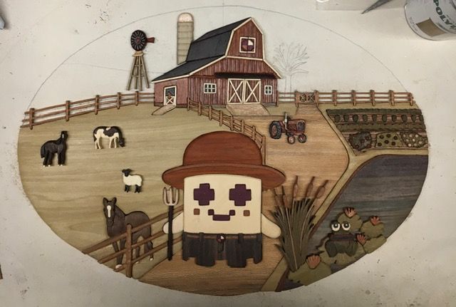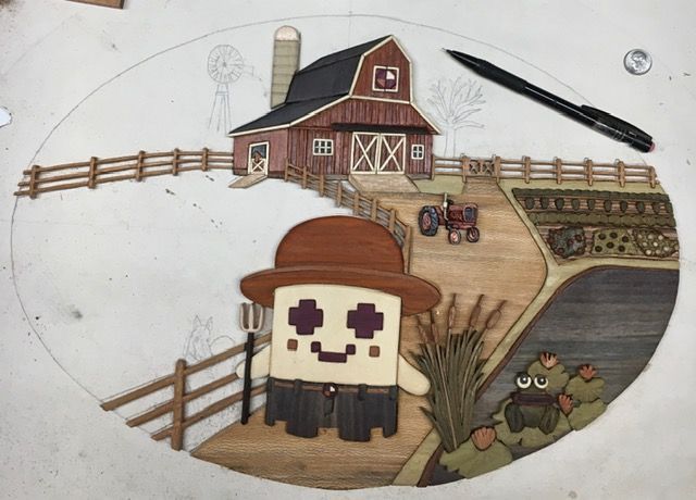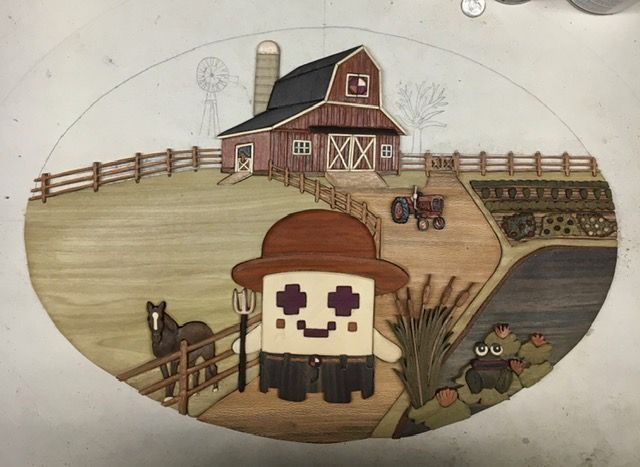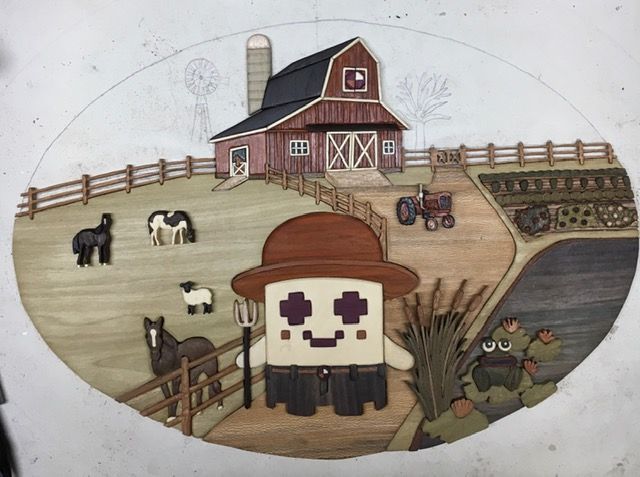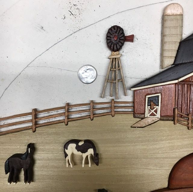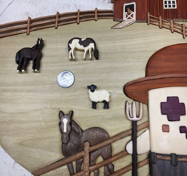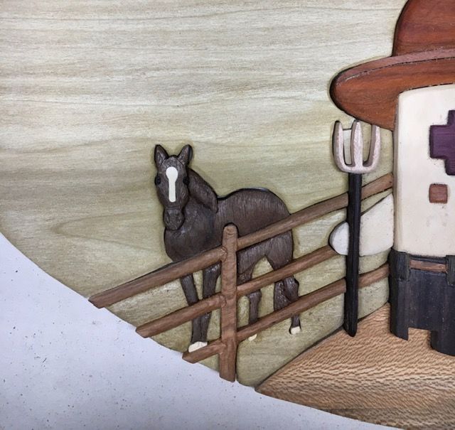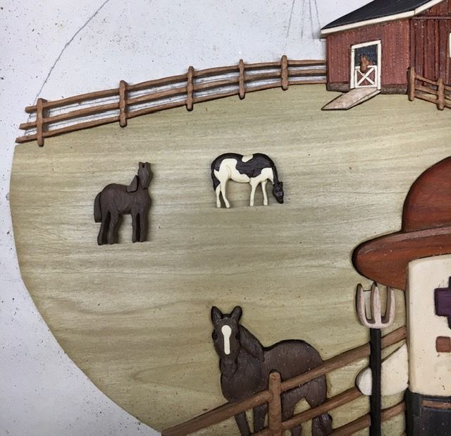 Got the fence under the barn inlayed and got the first horse done. Up to 400 pieces from 24 woods. Having fun now!!
