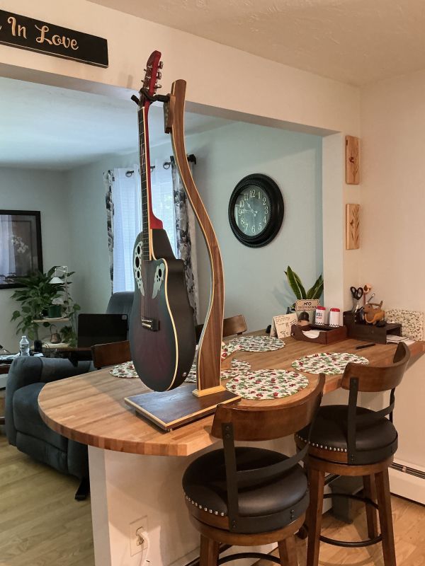 Popular Post Pauley Posted July 31 Popular Post Report Posted July 31 (edited) Well, I “was” fully back in the shop and started to work on a guitar stand. I haven’t played in years but i got a guitar and im going to do my best to get back into it. Here is a photo of one i seen online and i was inspired to attempt this, with one exception, im going to have a small storage place under the base for all the little extras…but we will see. So far this is what i have done, before another accident happened. Stupid is as stupid does…10 stitches and super glue to close the wound. (Never ever grab a bandsaw blade while it’s still running),..anyhow, what my plan is, is to have the base split and have it hinged to lift up to access the storage. I’m on the look out for a hinge that can be mostly hidden. Ill try to put up more photos as i go along. Oh, as luck would have it, once i had the stitches taken out, I started in the shop again, and my luck would have it, the blade on my bandsaw broke, so i called it a day. Oh, im using walnut and yellow heart wood. Edited July 31 by Pauley HandyDan, Gerald, 4DThinker and 9 others 5 7 Quote