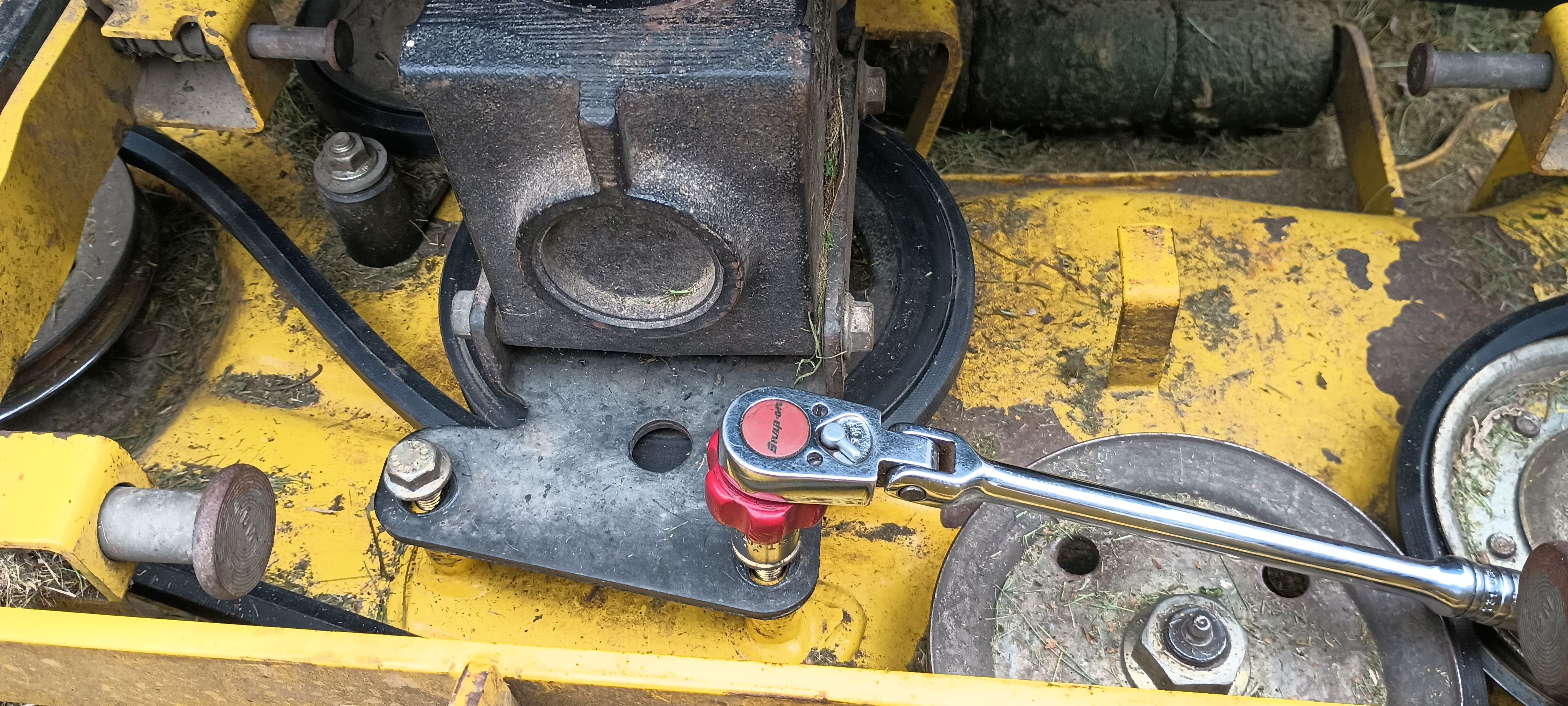 Popular Post Grandpadave52 Posted August 5 Popular Post Report Posted August 5 (edited) Old belt off by the new belt. Deere dealer OEM replacement version is about $150. I bought 3 (to have in inventory) aftermarket off the bay for about $35/ea which includes shipping to my door. Step on the belt and stretch it out it's about 5' long. 6 sided belt; somewhere between a 5L & 6L cross section. 54" mowing width. Like wrestling a rabid snake. Have to remove this gearbox to get the belt wrapped around the pulley. Four bolts on the bracket. 2 front, 2 rear. You can leave the PTO shaft connected. Looped around all the pulleys, set the gear box on its mounts, then tighten the bolts. Gearbox self centers. Leave the belt off the far left spindle pulley (right in this view) to roll it in place after the big idler tension spring has been installed. Pull for all you're worth to connect the spring, then pull even more to roll the belt onto the pulley. Gloves are required and watch your fingers; VOE 1 hour later its on, tools put up. No idea what Flat Rate time is. Probably a lot less for a 22 year old with good knees, good back and doesn't wear bifocals. Mowed until 8:30. Still have ~acre to mow, finish the roadside and some fence rows. Then start over again. Grass was really tall and WET. Rain will be here by midnight, off/on tomorrow. Edited August 5 by Grandpadave52 Gerald, HARO50, HandyDan and 4 others 1 6 Quote