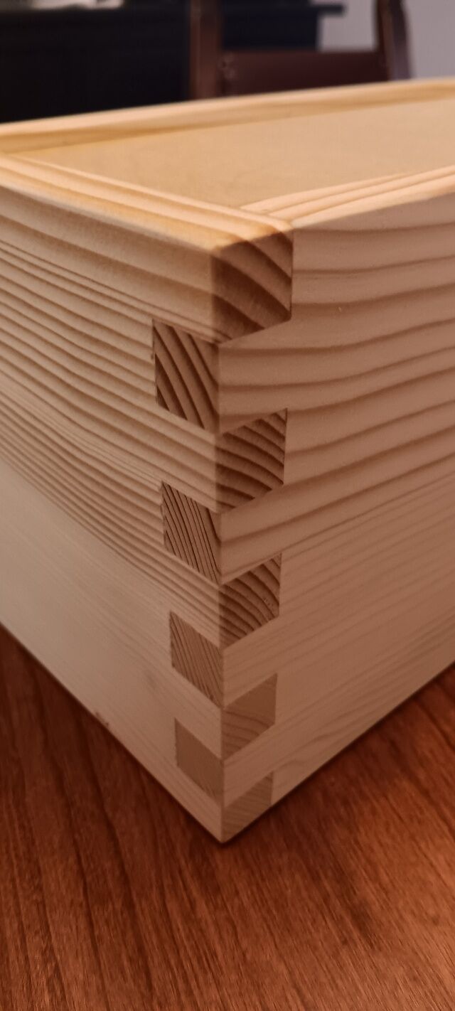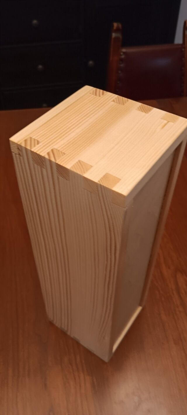 Popular Post MrRick Posted October 1 Popular Post Report Posted October 1 (edited) My daughter just had her birthday and as part of her gifts, we bought her a nice bottle of Canadian wine called "Pink Ink" from Vintage Ink. Of course it needed that special box. So I made this box finger joint box out of Pine specifically for the wine. The lid slides open very nice and snug so there's no rattling around. I placed clean shavings around the insides and bottom. When the lid is closed you can turn it upside down and nothing moves. This is an end view showing one end, side, and bottom. Here's one corner of the box finger joints. This is what it looks like when closed. I finished the box with one coat of 1 lb shellac and two coats of wood butter. Thanks for looking! Feel free to comment, ask questions and thumbs up if you like it! Cheers! MrRick Edited October 1 by MrRick lew, Gordon, John Morris and 4 others 7 Quote