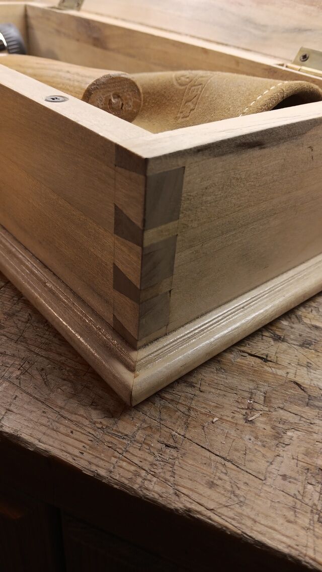 MrRick Posted October 15 Report Posted October 15 I made this box all with hand tools for my Stanley 750 Sweetheart Chisels. Made out of Spalted Pine. Just look at that grain!! Seldom do you see spalted coloring! Brass hinges were installed. Also magnets and screws for snugging the lid securely. Handcut dovetailed corners. Handcut moulding all around lid and bottom perimeter. Applied finish is General Finishes Water-Based High Performance Polyurethane from Lee Valley. Thanks for looking! Cheers! MrRick lew, Gunny and Grandpadave52 3 Quote