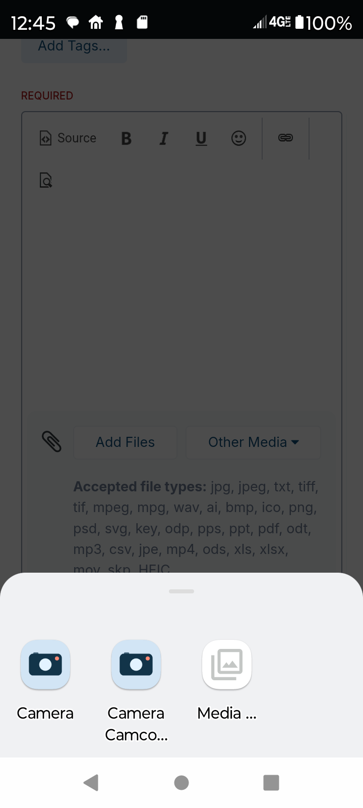 At the bottom of the window, where you add your post content you will see an area where you can add files and the type of files that are allowed. Most of use use JEPG files but others are permitted. When you touch the add files button, a window should open asking permission to access the files OR ask you where the files are stored on your phone