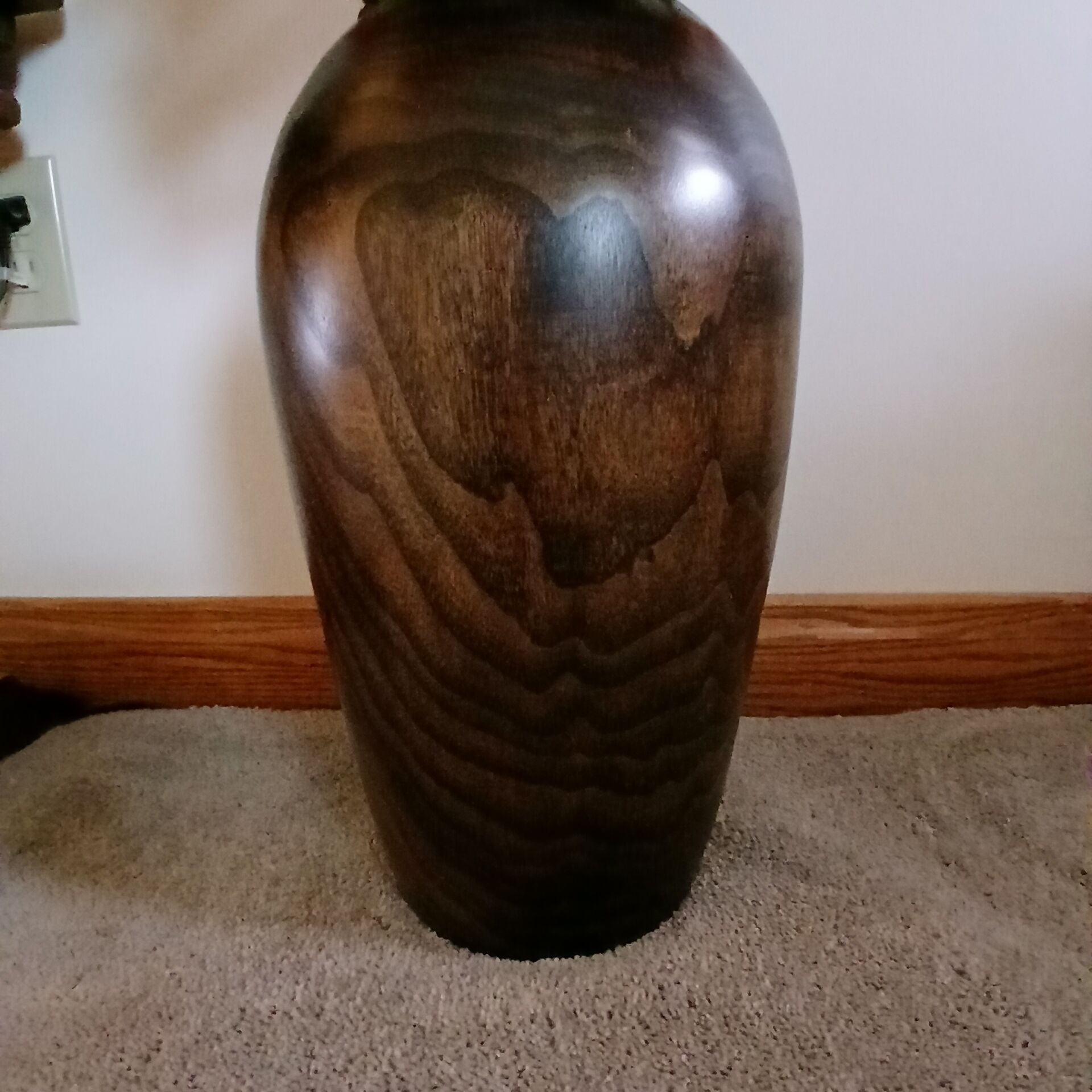 20251119_073335.thumb.jpg.58c1c119715742eca24959c9d5783a8d.jpgnot a very good picture as this is already in corporated in SWMBO living room and is full of flowers bottom vase is 16 in.tall and about 8 in dia at largest point,black walnut hollowed to 1/4 in wall with 4 coats of mat finish lacquer.