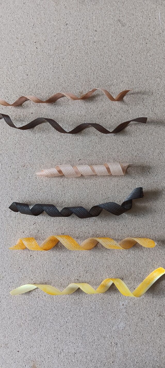 MrRick Posted 14 hours ago Report Posted 14 hours ago (edited) I had the idea of adding a splash of color when making wooden ribbons by applying a dye. So I have it a whirl. I used two different kinds of cedar. These are 1 and 3 below. I'm not sure exactly what kind but they are different. Using cedar 1 above, it was dipped into a jar of Iron Acetate. This is the result as shown in 2 below. Next you see cedar 3 (the second kind of cedar) below It was dipped into the same jar of Iron Acetate. This is the result as shown in 4 below Then I took another ribbon of cedar 3 and dipped it into a Tumeric bath as shown in 5 below As a side test I took a ribbon of Pine and dipped it into the Tumeric bath as seen in 6 below The results are all encouraging for applying dyed colors to wooden ribbons. Thanks for looking! Feel free to comment, ask questions and thumbs up if you like it! Cheers! MrRick Edited 14 hours ago by MrRick Grandpadave52, lew, Headhunter and 1 other 4 Quote