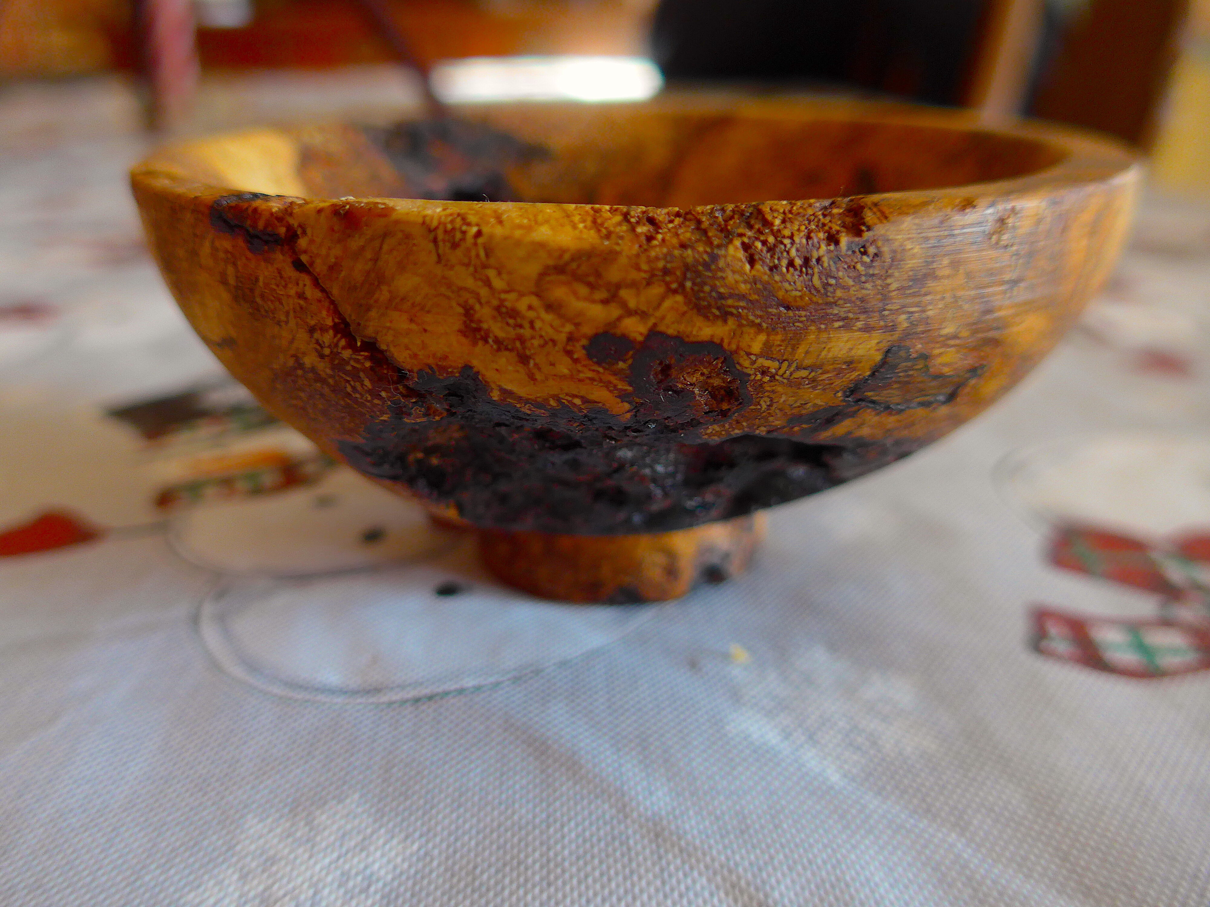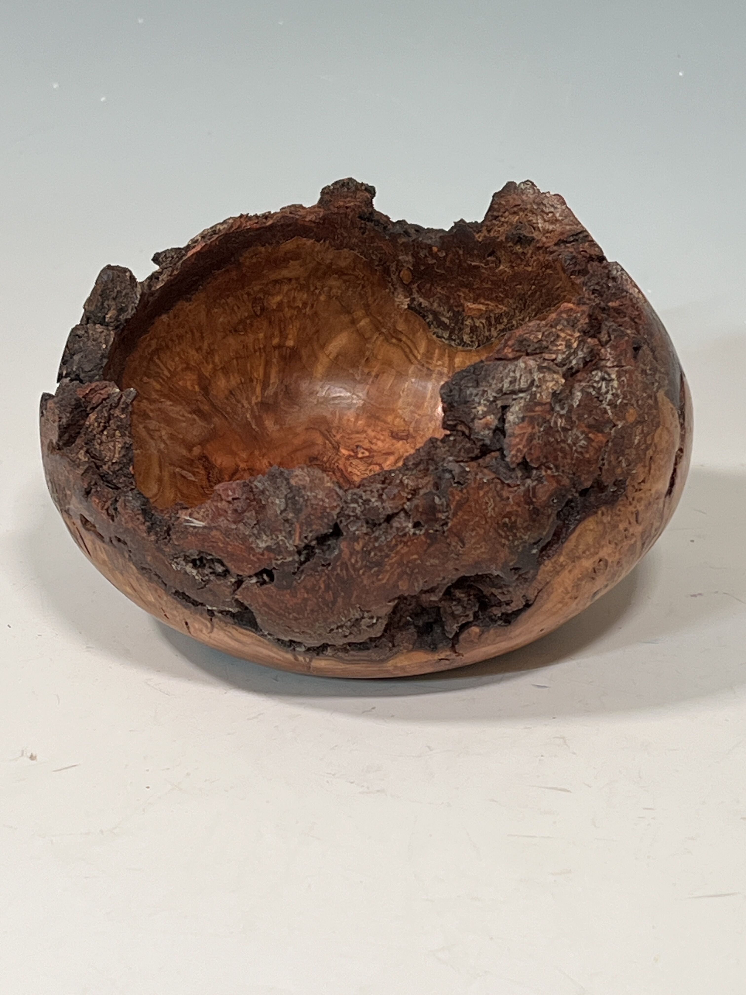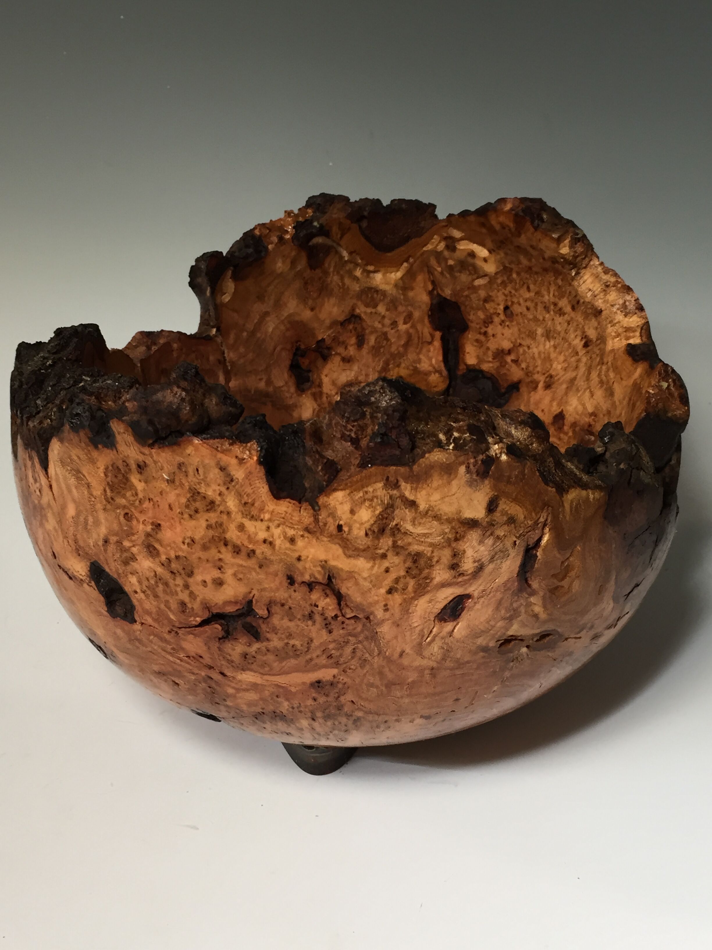 A friend gave me a gigantic cherry burl plus two more smaller but still good sized ones. I mad this bowl for him. Had no problem with bark coming off and it did not break.Just maybe I am getting better