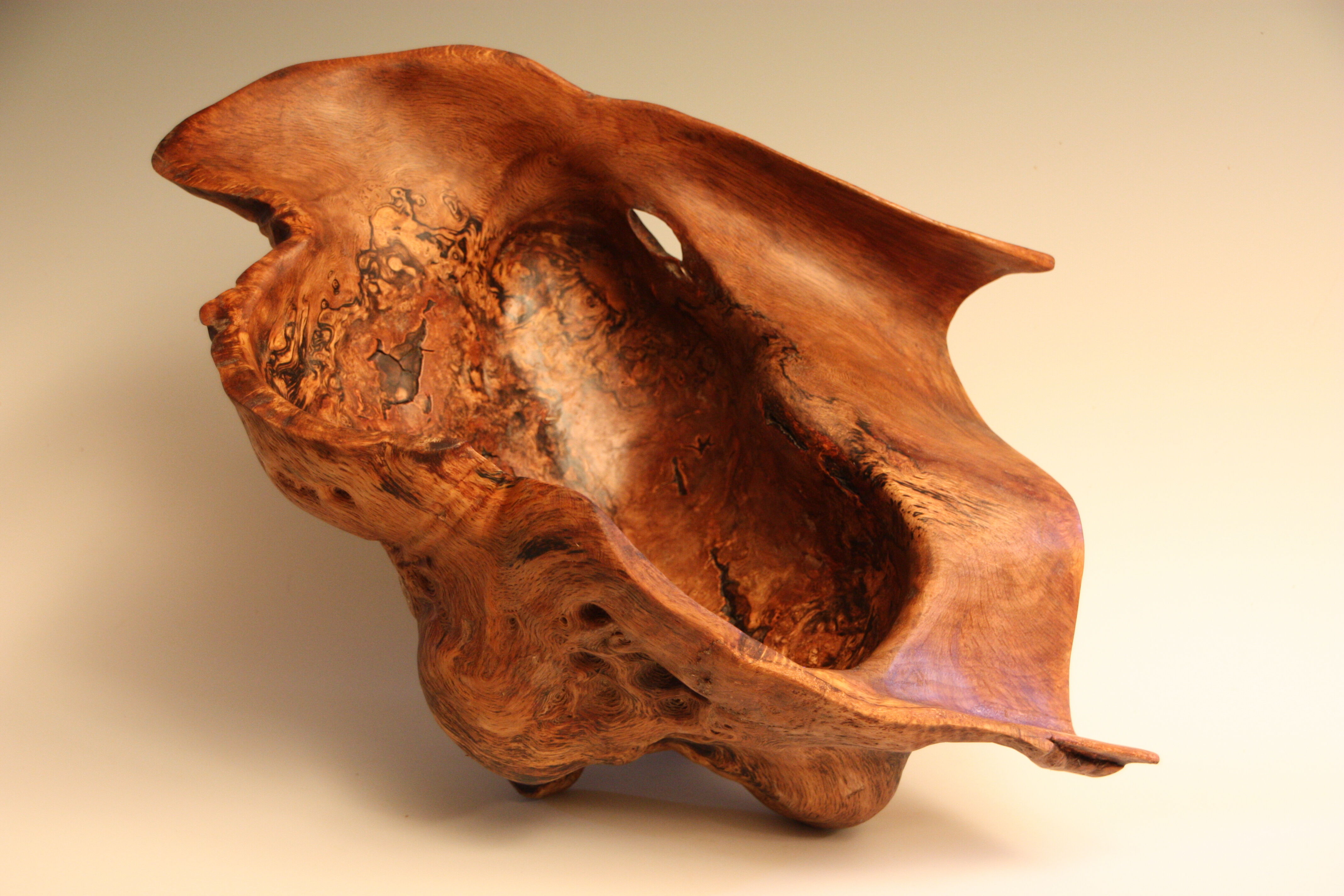 this was a commission. Lady in NOLA cut this from a tree in her yard. I could not see a way to turn without really cutting it up p and it had beautiful swirls under the bark. Turned a bit yo hollow and then power carved. I found it to have 3 ways to display. This is the one I like best. This one is live oak.