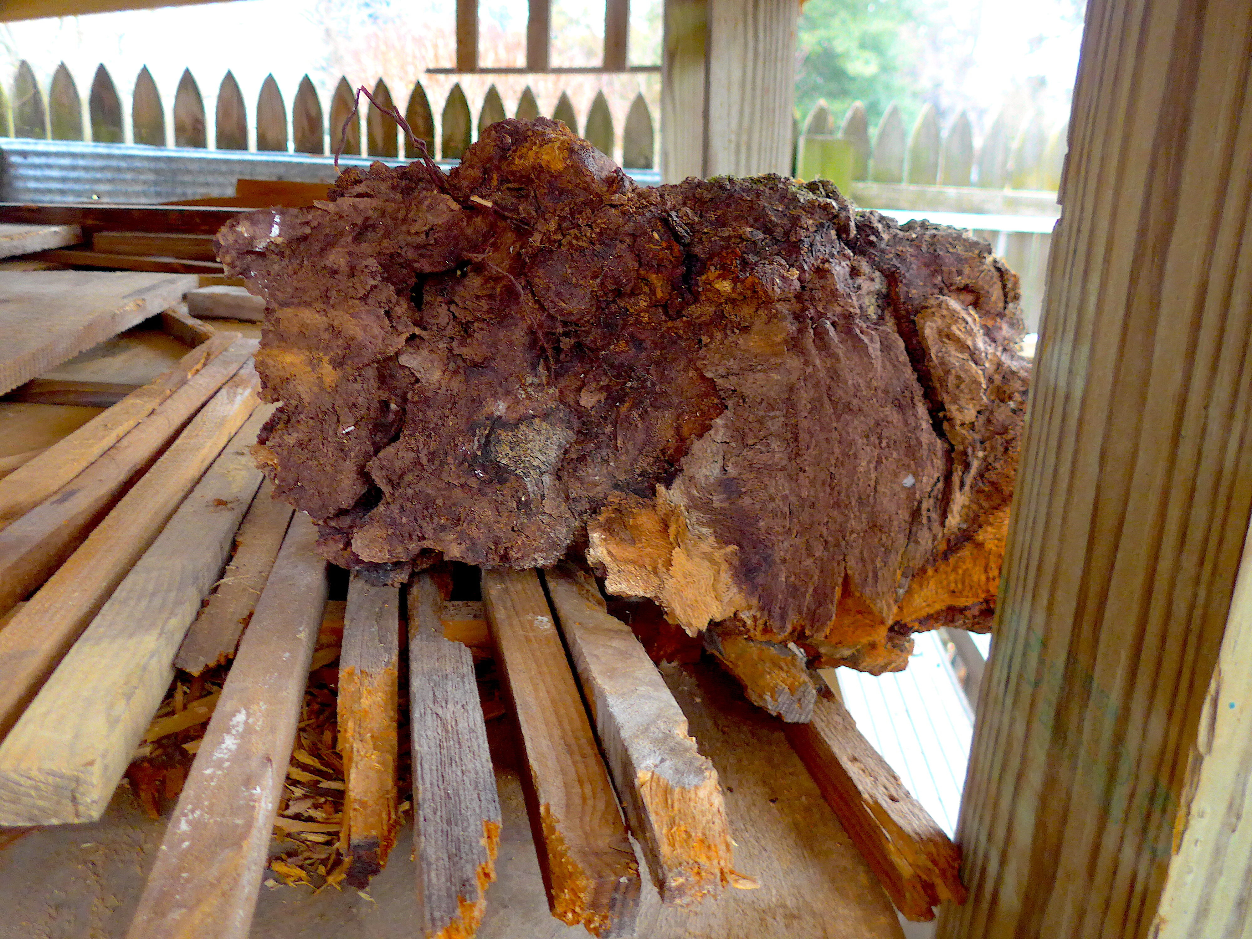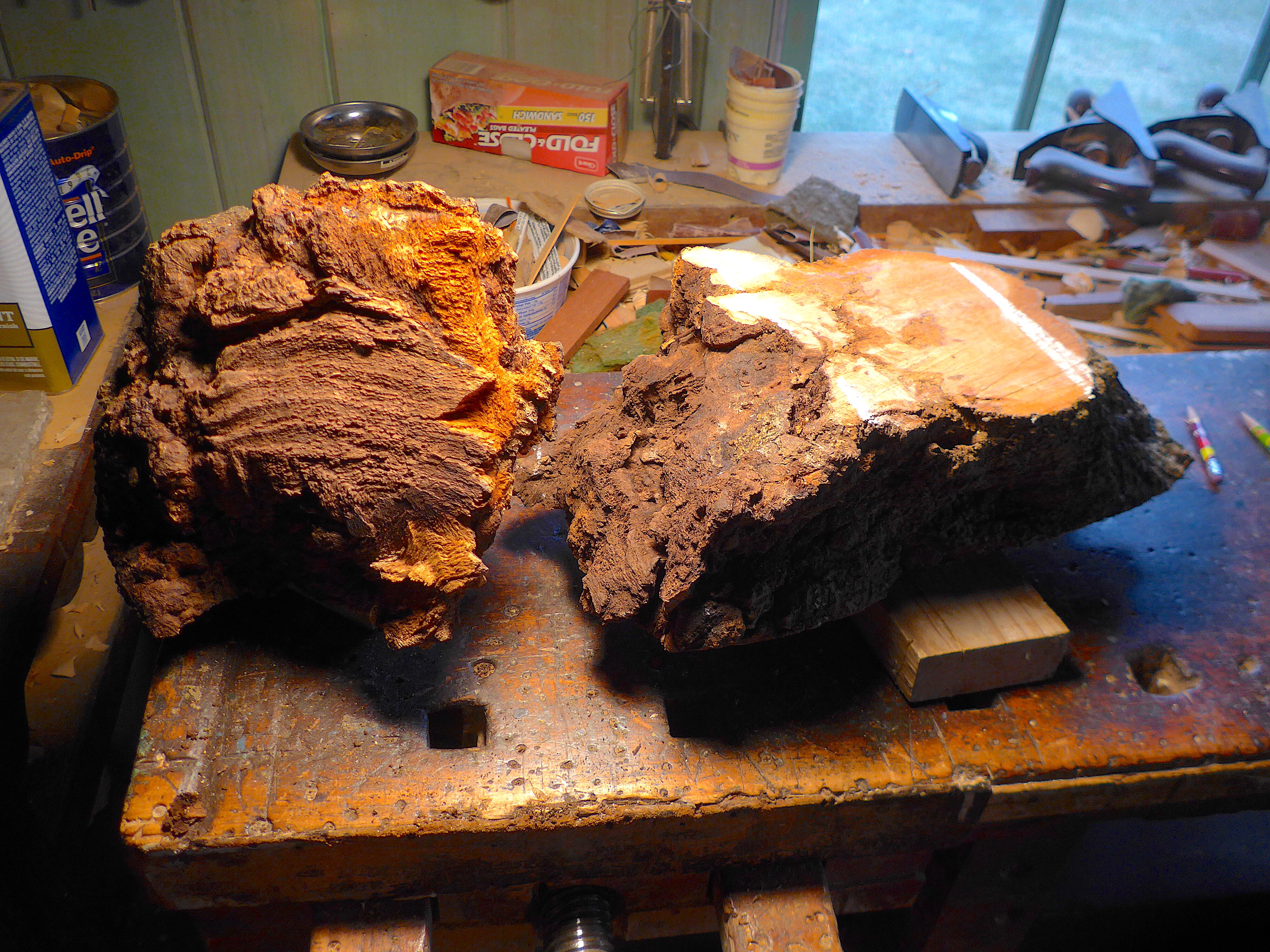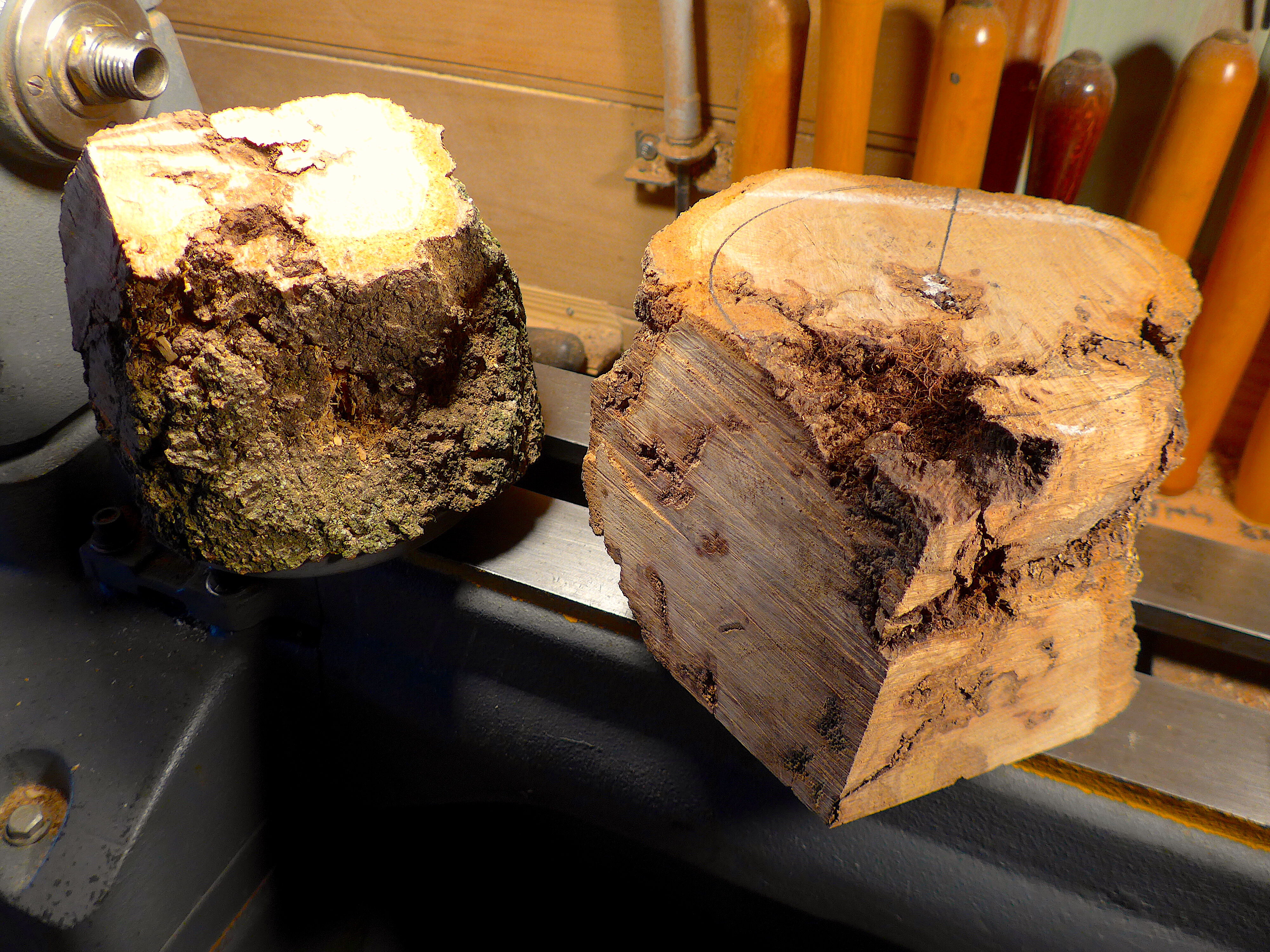 Burls cut down to manageable sizes. In order to have them fit the lathe, I had to use a hatchet to knock off the sharp corners. These things are HARD wood.This allowed them to spin without the corners clipping the banjo or tool rest. Things are still somewhat unbalanced but 10 minutes, with a roughing gouge, should smooth things out considerably. Now, for what lies within!!!L1110695copy.thumb.JPG.322a8819f237833707c5b10d60d8ad90.JPG