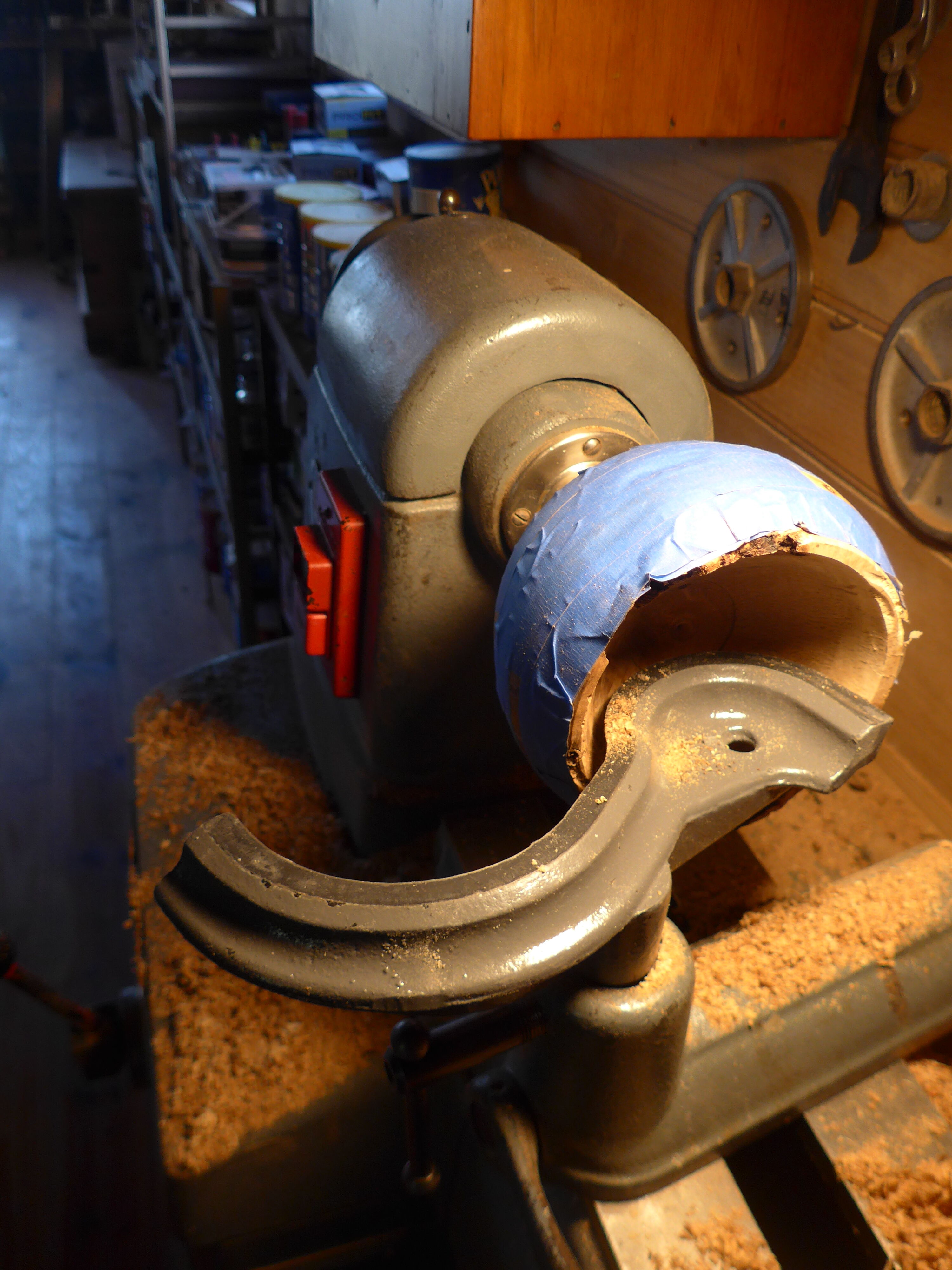 Here's the progress on that large red oak burl. A piece of the spigot collapsed and the bowl was sent flying across the shop(held in place by a chuck). I cut off the spigot, planed a 3" flat on the bottom , and now am using  3" face plate to hold things in place. I'm also encountering motor problems with my lathe. The motor will shut down when I'm working on the inside of the bowl. Any suggestions as to why the motor is quitting on me? I'm able to restart motor after hitting the off button.