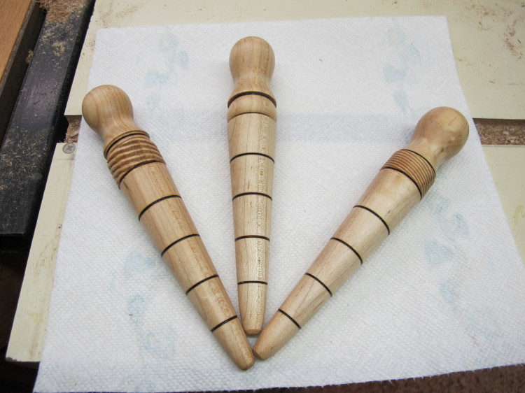 These are called "Dibbles" or "Dibbers" and are used by gardeners for making holes to plant bulbs/seeds. These are roughly 8" long and a little over 1" in diameter. The rings are 1" apart to assist in the planting depth. I used a wire "Garotte" to burn the marks, thus making them more visible. Made from hard Maple that had dark streaks. I made 10 of these. Maybe I can sell them for $5 each. The finish is a bee's wax/mineral combo.