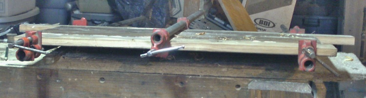 In this shop, that IS a little joiner.   Added a couple 1x3 of barn wood, one on each edge, abd glue it up.    Now I just sit back, and watch glue dry.....I'm bushed.