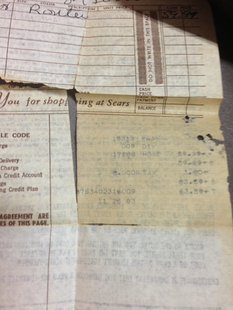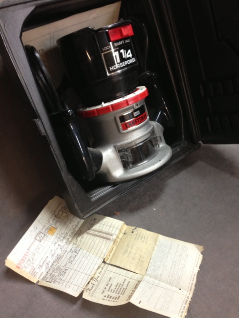 I was looking for a jig in the shop last night and ran across this plastic box I had forgotten I had put away under the cabinet. My dad purchased this 1/4" 1 1/4" HP Craftsman Router model 17568 in 1983 and it was still in the box with the receipt tucked under the edge of the box. I had opened the box and pulled out the plastic case to see the router some time back and not sure why I threw away the cardboard box.