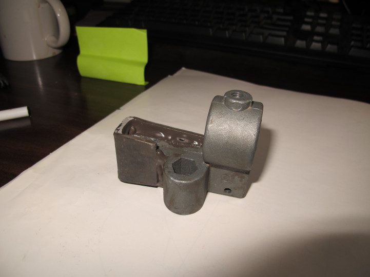 Well, in an effort to get the bandsaw working, at least temporarily, I made a "U" shaped piece out of some steel strapping. It was a little thinner than 1/8" and 1 1/4" wide. Created access holes for the adjustment/mounting hardware and then JB Welded it in place. I'll post a picture of the Rube Goldberg contraption when the Weld sets up. Needed to heat the steel in order to bend it and it bent a little crooked but I think it will be OK.