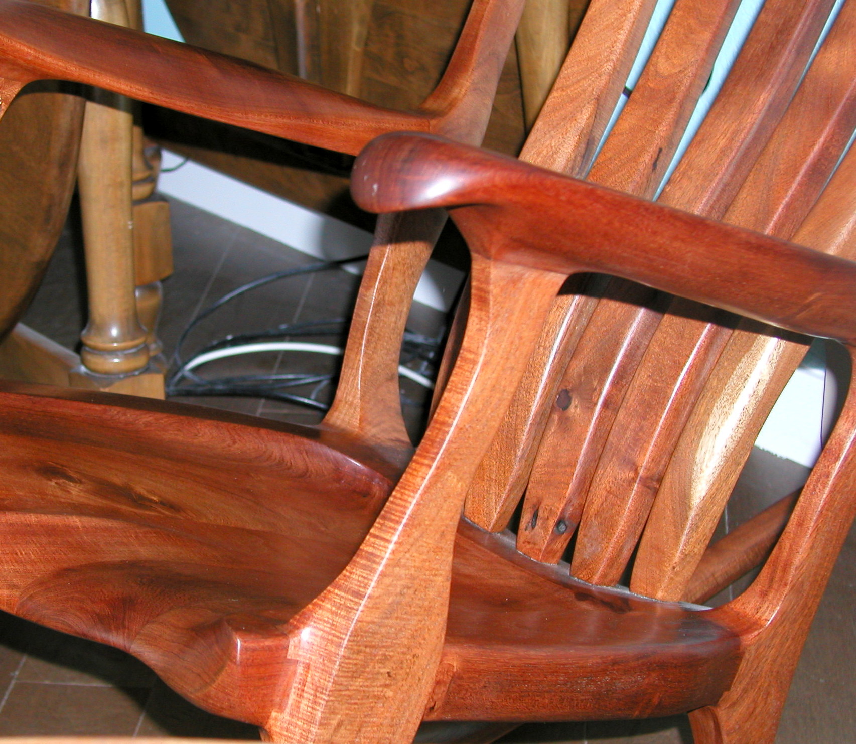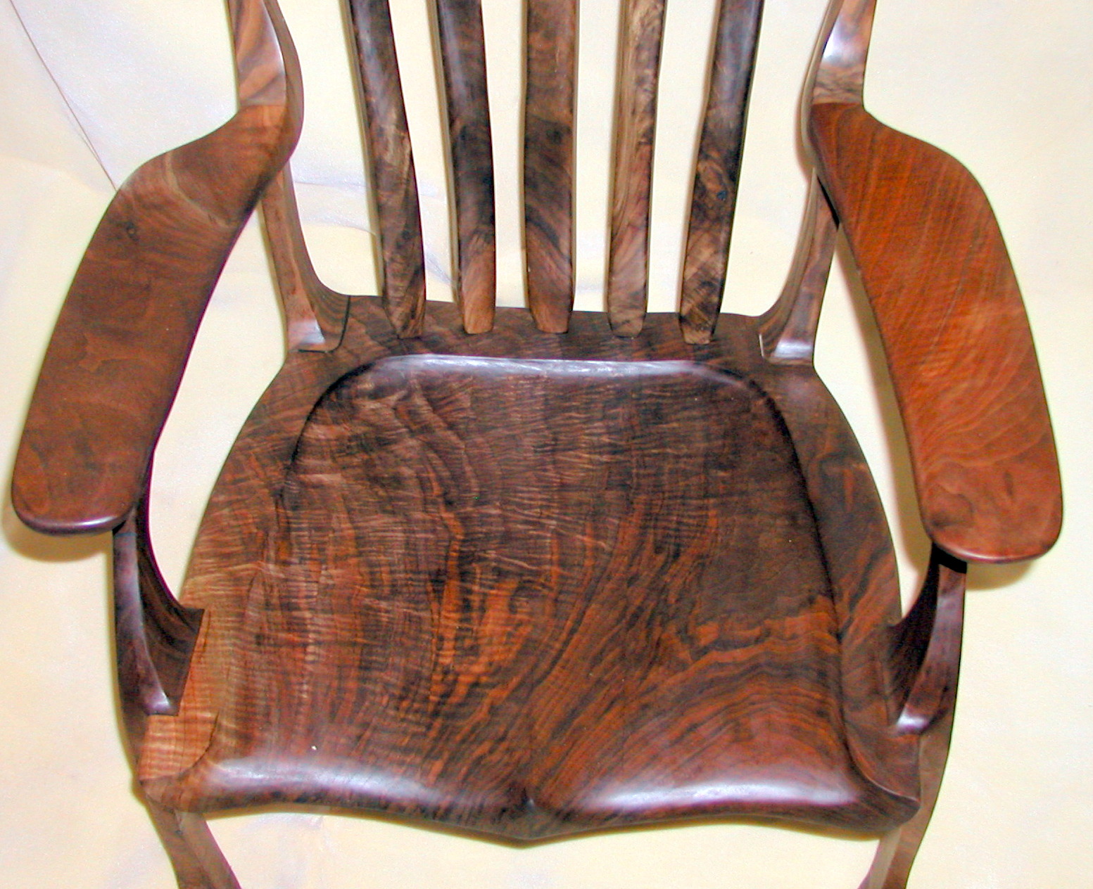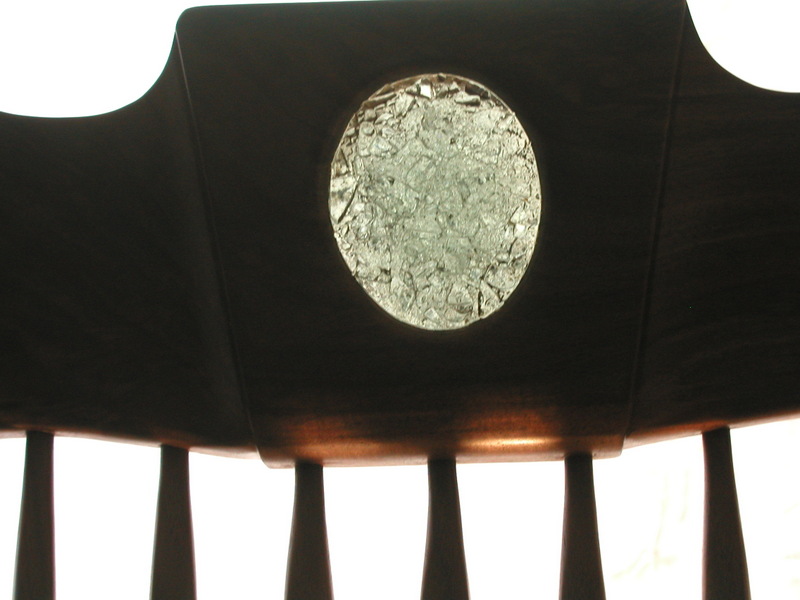 Heron rocker made of Bastogne Walnut with molded glass, Ivory and ebony accents. Note the 'Ranch' front leg
