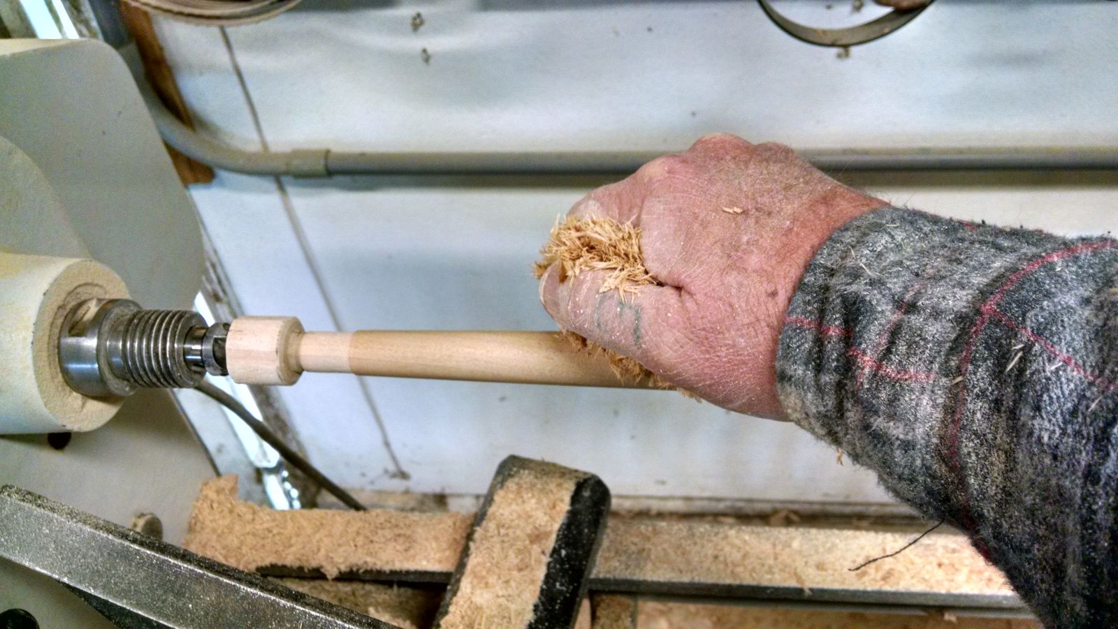After each chair piece has been sanded to 600 on the lathe, I pick up a handful of shavings and push them onto the piece while it's spinning at max RPM. An instant sheen or glow appears, I enjoy this final touch before I pull it from the centers.