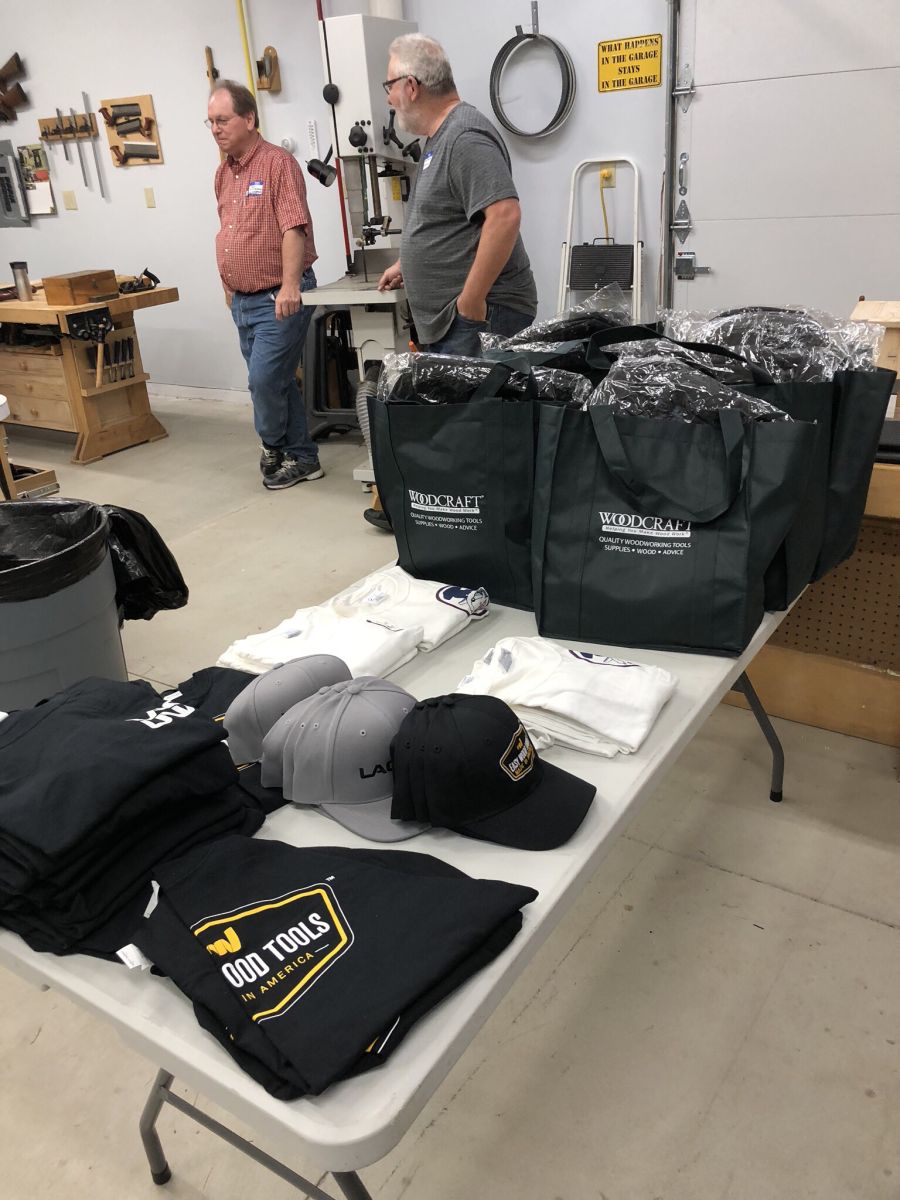 GrandpaDave and Ducksoup guard the table of gifts. Easy Wood Tools, Laguna, and a Woodcraft generously donated t-shirts, hats, mugs, bags and more for the swag bags. TPW even gave a few shirts.