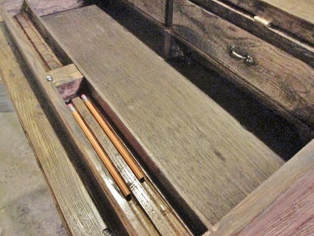 with a couple new pencils. Details of the drawers. Flat area is a piece of 1/4" Luann Plywood. Silver spot was there to separate the lid while the varnish dried