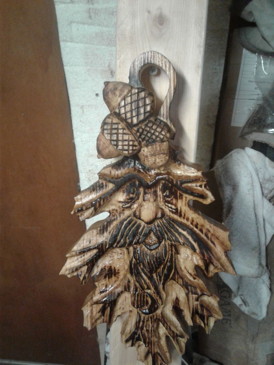This little guy was done by several different saws. I then took the time and by dremel, got it burnished with burrs and stones to obtain a smooth look. Torches and stained the pine piece to give an old look. Only about a foot high.