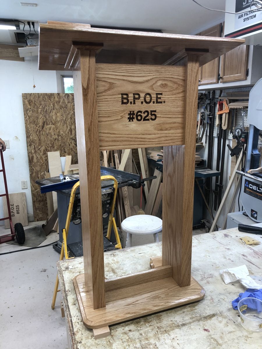 The verbiage was cut in with a Carvewright. Red oak laminated over walnut.