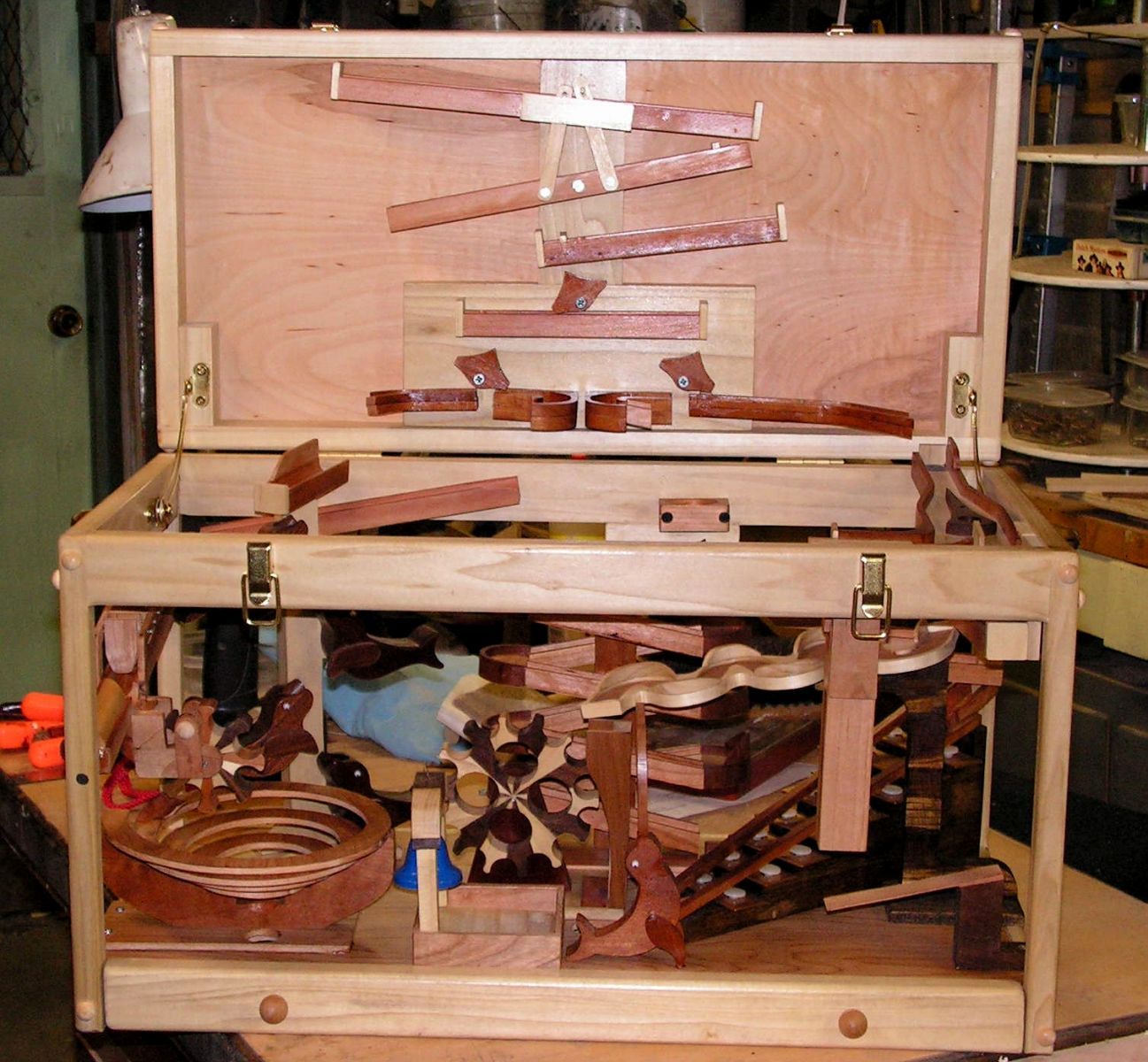 I made these games from web plans as gifts to family members. The tower was a gift to my grandson, who was 5 at the time and he played with it for hours. It is still a big hit with all kids. I made the chest for use here at home when kids visit. It is more fragile and has 8 separate trails for marbles to travel