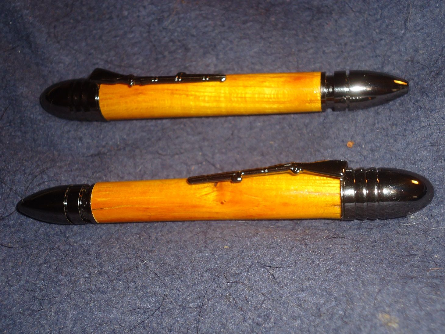 PSI Civil War Twist Pens in Gun Metal Finish. The Metal part at each end of the pen is a recreation of a projectile used during the civil war and the clip is a civil war era rifle. Osage Orangeblanks. Finish is two coats of Boiled Linseed Oil applied a day apart. Then six coats of Minwax Wipe-One Gloss Poly Finish applied one coat every other day.