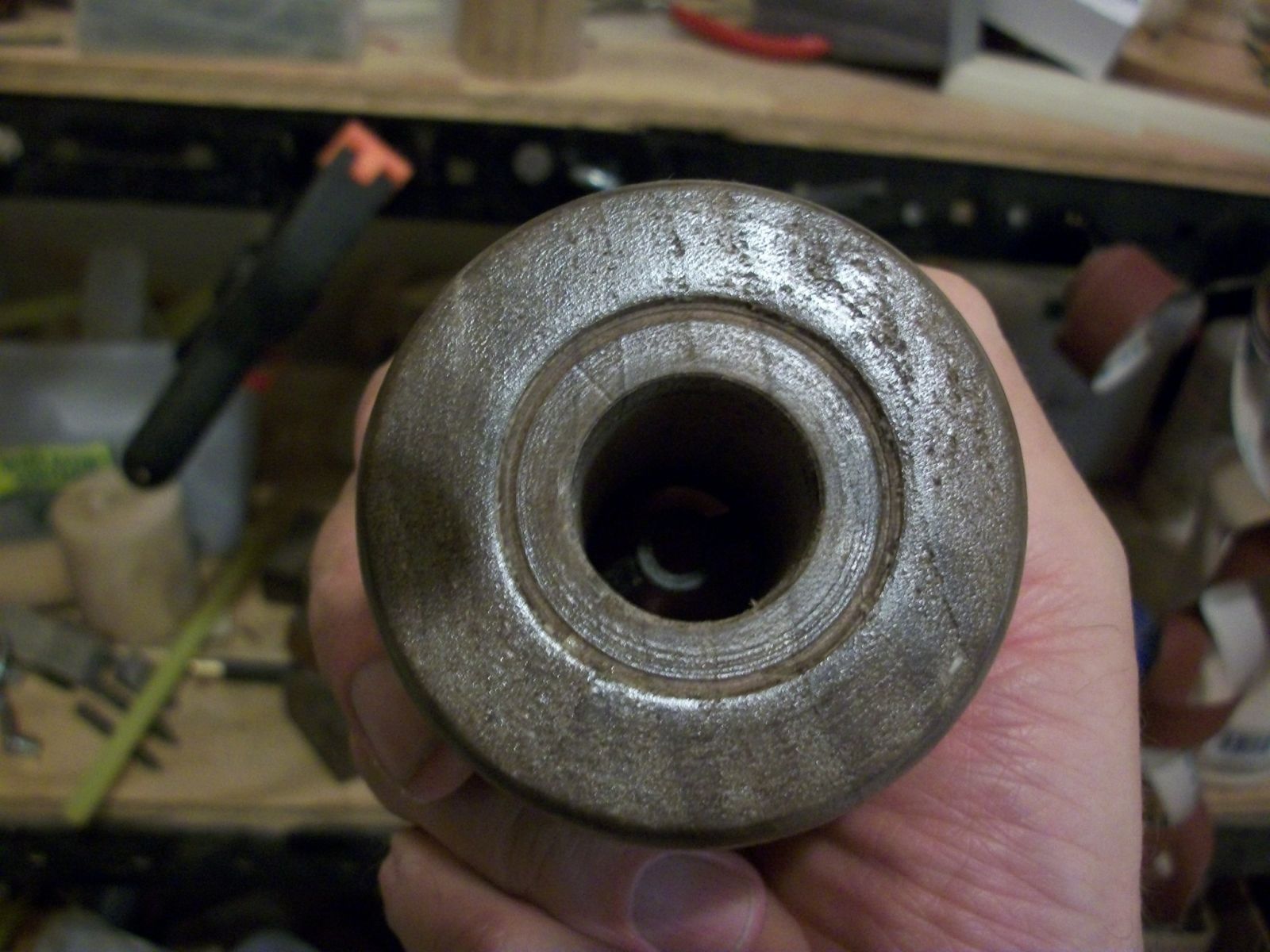 Top of the walnut pepper mill I am trying to finish. Note the nasty tearout problem on this end grain, doesn't seem to matter what tool I use to try and stop it other than a large forstner bit. That MAY work IF I had one.