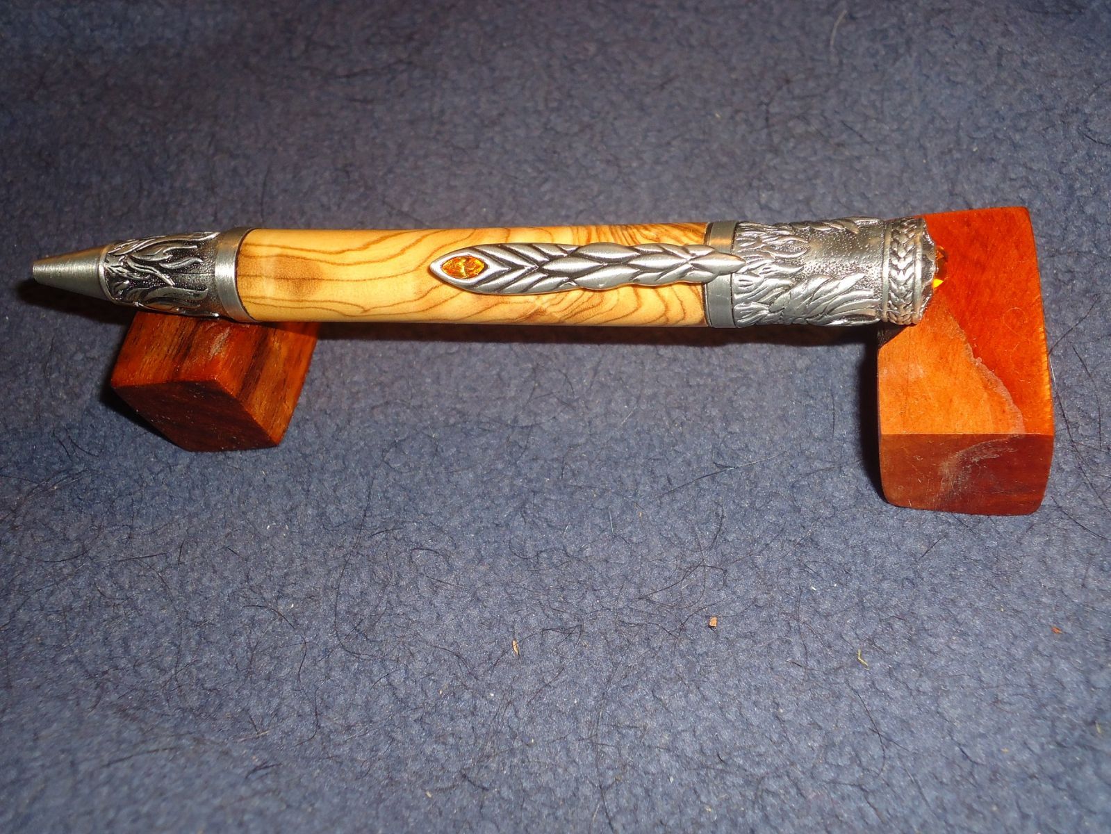 PSI Phoenix Rising Twist Pen in Antique Pewter Finish with Bethlehem Olivewood View 2 of 2.. After turning, pen blank was sanded up to 600 grit, then wiped down twice with Denatured Alcohol. Pen blank was then treated with two applications of Boiled Linsed Oil - one day apart. Then six coats of MinWax Wipe-On Gloss Poly were applied - one per day.