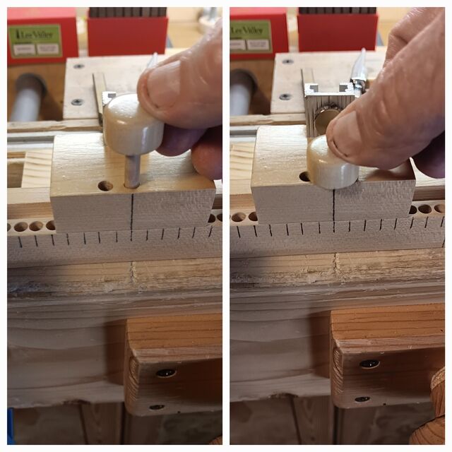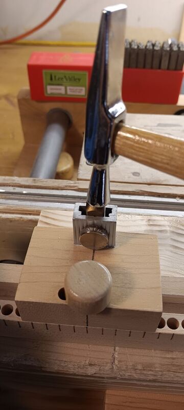 This is a Hand Stamp Spacing Guide that I made a few years back. I designed it to be used with Lee Valley's 2mm, 3mm and 5mm letter and number stamps. It allows you to punch mark wood or metal with clear, evenly spaced characters. Here's the setup: I've clamped it on top of a workpiece secured in my vise. Then you just slip in the Punch Stamp as shown... ... and give it a couple taps with a small to medium size hammer. To punch one letter or number after another, You can move the punch holder by lifting the locking knob to next hole and putting it down to lock. Put in your next letter or number punch and away you go! You can also move half spaces by moving the locking knob to the left hole as shown here. Here's one of my boxes where I've used my Hand Stamp Spacing Guide and punch stamps to identify the box. Thanks for looking! Cheers! MrRick9 points -