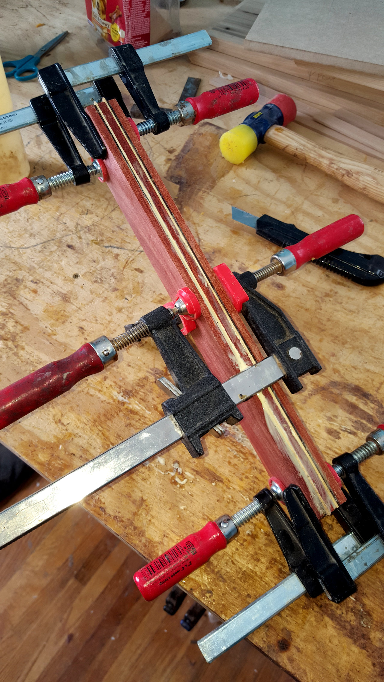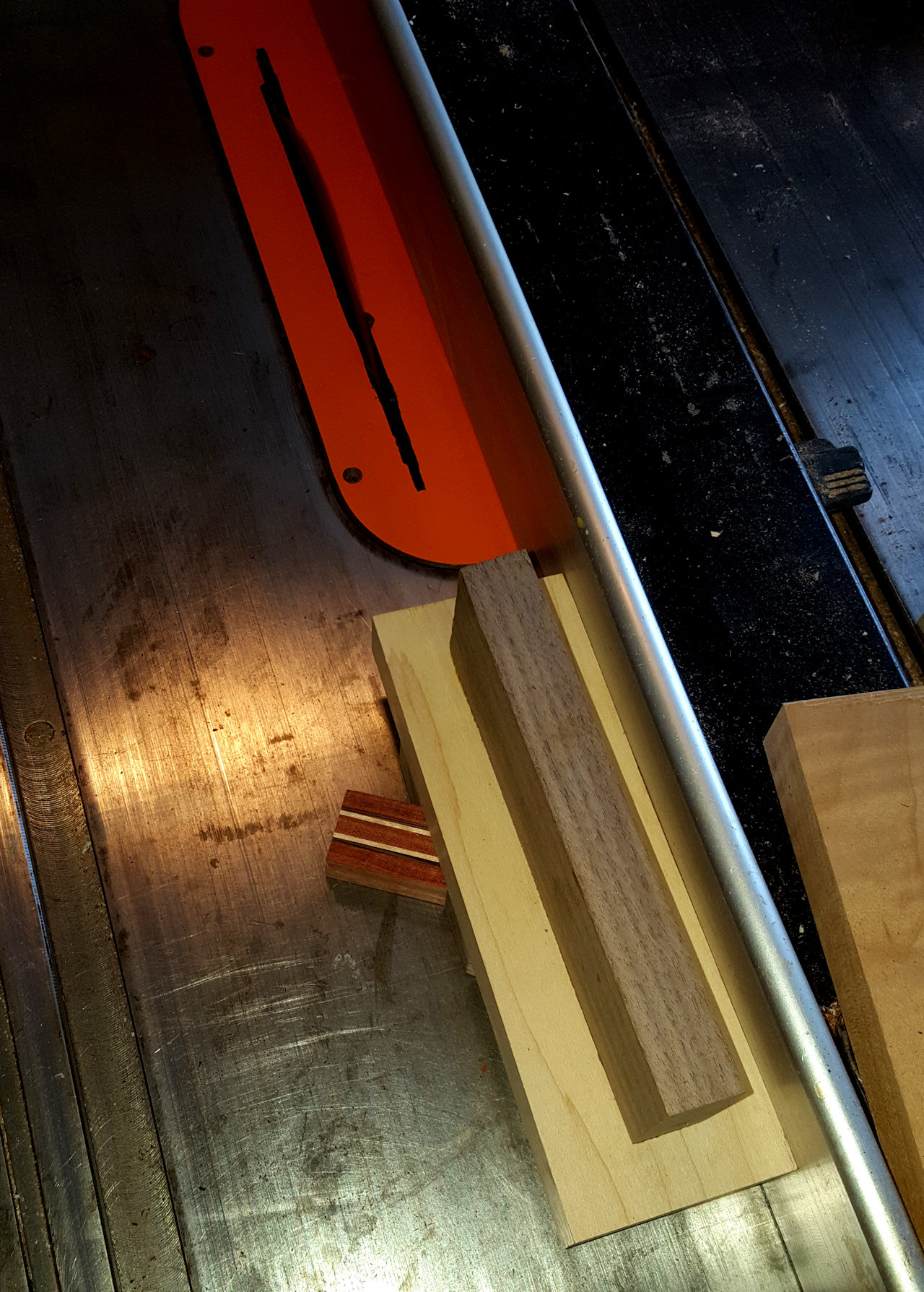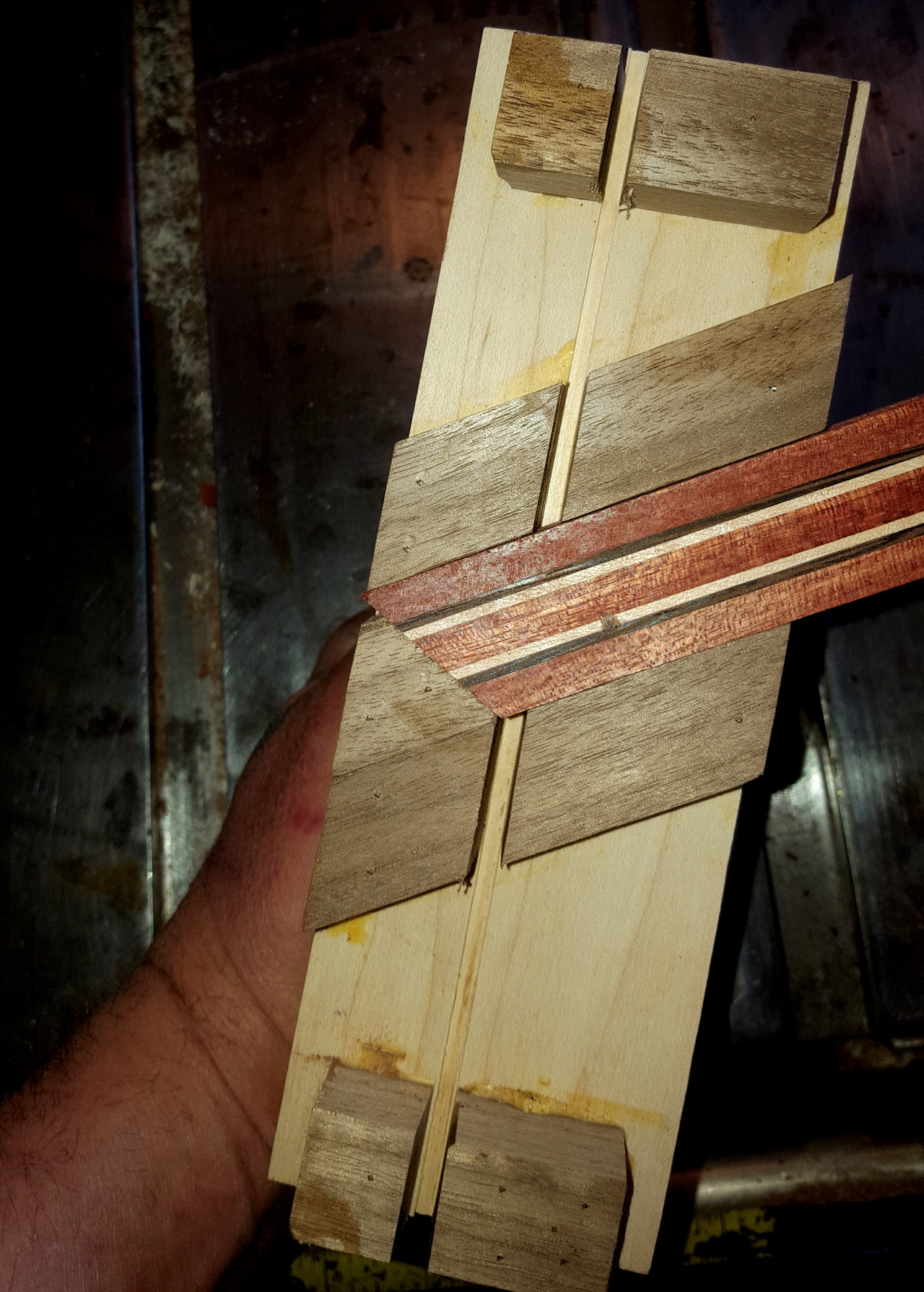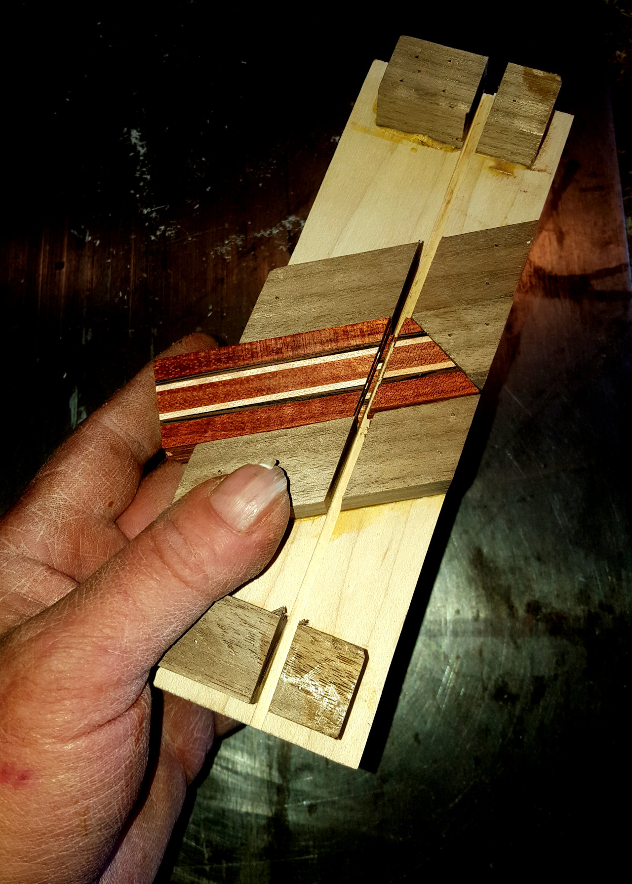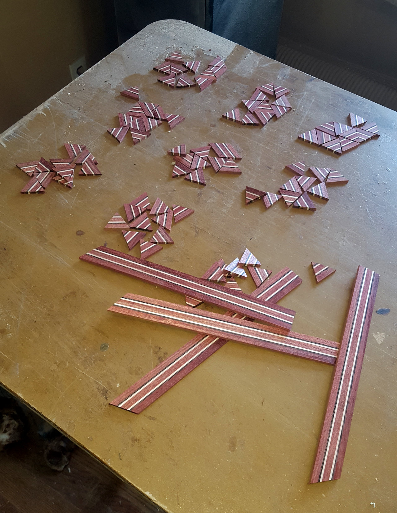 I'm in the process of making some decorative inlay for a box..... but, I would imagine this could be put on anything if one so desired.... I used three pieces of 1/4" thick bloodwood, and two pieces each of 1/16" thick maple and wenge to make the 1" thick laminate....once dried and cleaned up, I sliced off from the edge several strips about 5/32" thick.... you can cut as thick as you like, just make your jig and dado work with that dimension... then cut a 30 degree slice off the end of each strip using your miter gauge. I cobbled together a jig to cut 4 triangles at one time.... flipping the strips after each pass..... Once you have enough triangles.... have some fun!18 points -