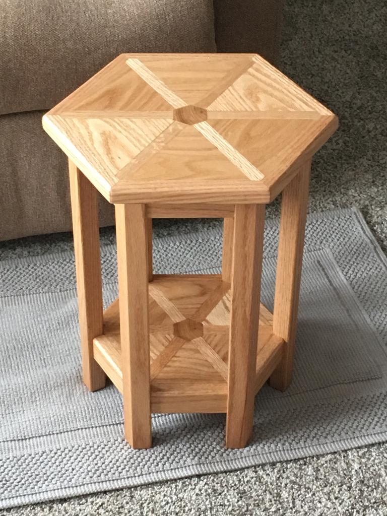 I made this end table without a plan . It had 50 separate pieces and 30 MT's The legs are 5 sided. This is the bottom of the top and lower shelf, legs and stretchers. The finish is one coat of shellac sealer and 2 coats of poly. I hope these pictures turn out. It is my first attempt of inserting photos They might be too big. RJR16 points -
