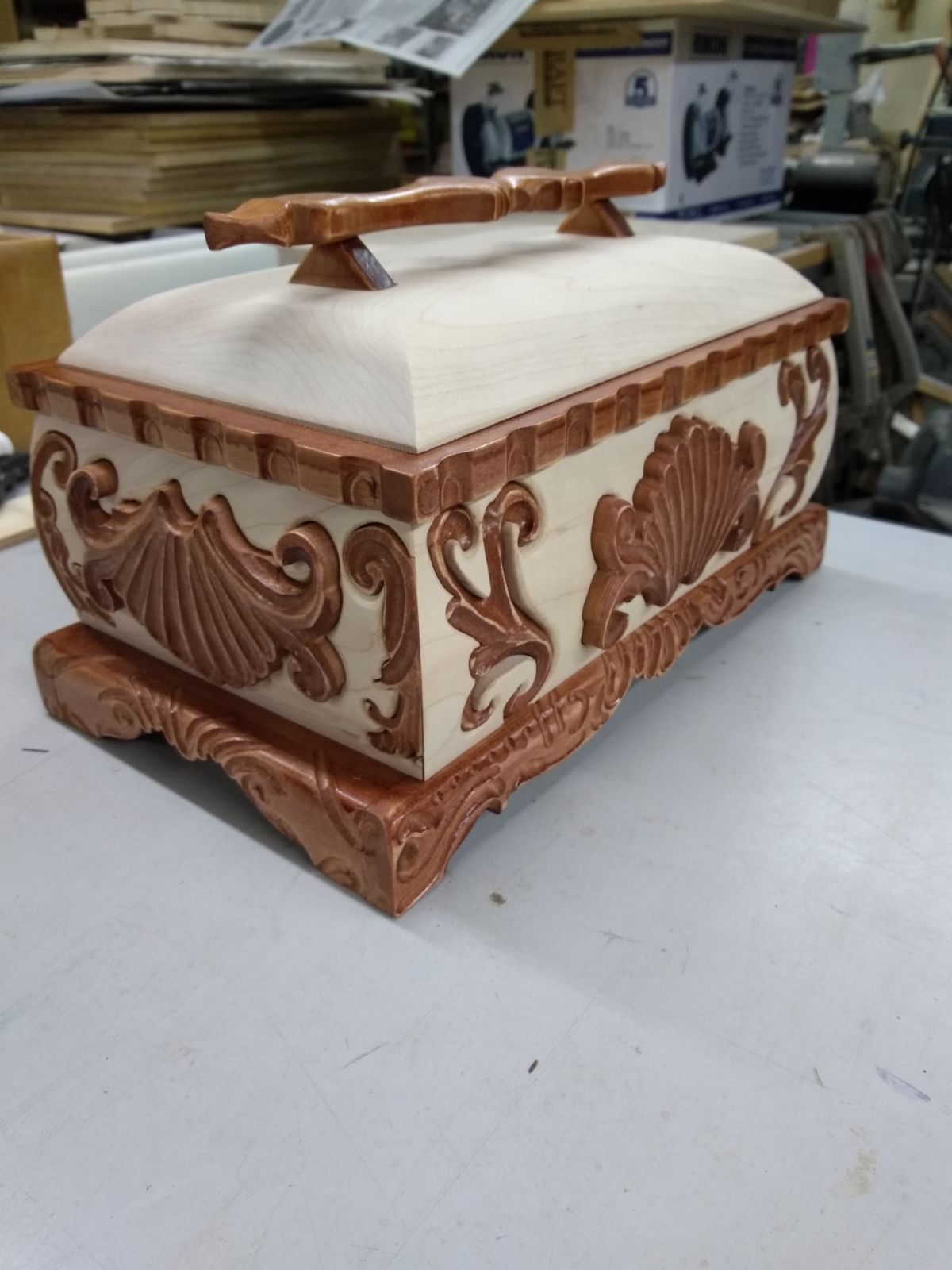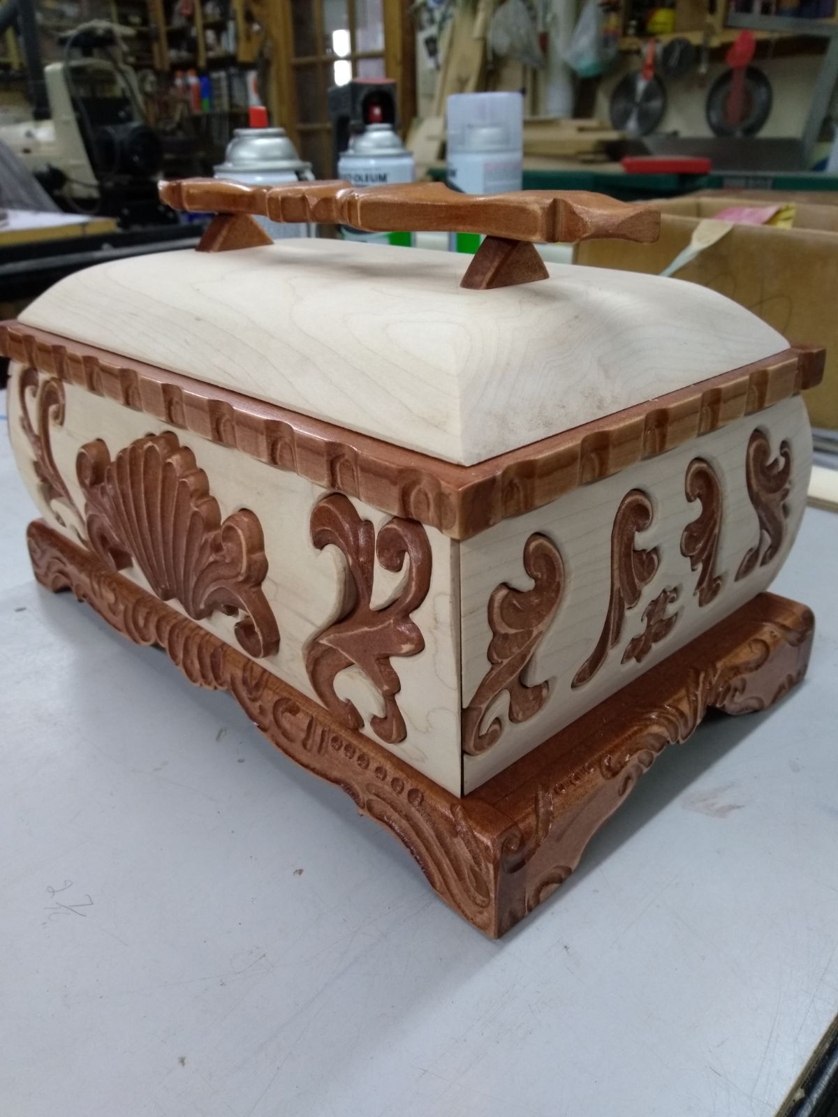 I'm still working on these jewelry boxes. There are lots of first time things going on with these boxes for sure..This box was the goat so I have a few things I wanted to see for my self. I had nothing on paper just in my head. It is sitting there with 4 screws holding all the pieces together so I could exchange things and then put it all back together. In a round about way this is almost like the rest of the carving I do. Like I have different carvings , some up and others down and one end is different that the other. Some of the pieces was in the wood pile from things I built from long ago....Like the handle on the top was the cut off sides from two pieces and I just glued them together back to back and I ended up with about the right length handle for the top. The brown base is four small pieces glued together and the brown top piece is four small pieces glued together and those are holding it all together or else the box would fall apart... I learned not the have the carvings too close to the ends for the wood is tapered 45 degrees and would cause problem later...These mistakes will stay with this box for a reminder for later..al the carving pieces was my own design and they will be pushed out more for the finished product.... and I still can't decide which way the carving should be , right side up or up side down? And since I tapered the lid, hinges and the screws that close to the edge might be a problem? Also I don't have to worry about ever seeing another box exactly like this for no one has a weird brain like mine!15 points -