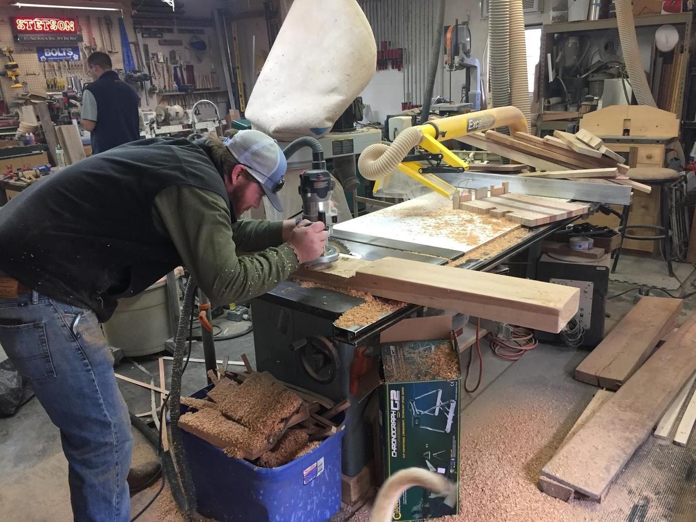 Well it seems as if fall has arrived. Last week it was in the 90’s and this week we are in the low 70’s. I love the cooler weather and we are busy in the shop. Today we are working on making and 8’, 2” thick Cherry Cross. Working on the half lap joints right now. At the assembly table we are ready pieces for cutting boards. And of course we still have cornhole boards everywhere. Last week I build this display piece for the range to put AR rifles in a horizontal position. i used my CNC to cut the mortises for the upright pieces. Finished it and took it to the range. So lots going on here and we are readying for Christmas. Whats on on your weekend agenda? I always love love to see your projects and hear about what you are working on. Share your photos and projects. Whatever you you do have fun and work safe! -