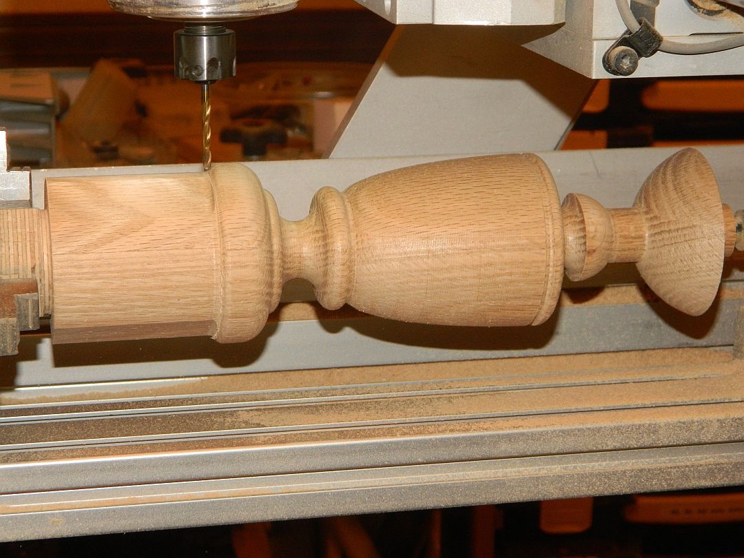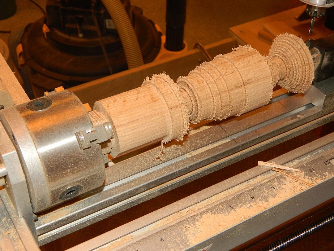 This is a sequence of images showing the steps from a cylinder of wood to a finished contoured post. Toolpaths were created in Aspire, but could have been done in VCarve Desktop or Pro. Wrapping toolpath to cut the initial square block into a cylinder. A roughing toolpath to remove most of the waste for the moulding contour finish pass. A moulding toolpath finish pass to shape the bottom end for eventual dovetail slots. Finally a Moulding finish pass using a 1/8" ball end bit on the top contour shape. Leaving on the rotary axis until I decide the best approach to cutting the dovetail slots. I may have to flip it end to end as I can't approach the bottom end where the chuck jaws are. 4D