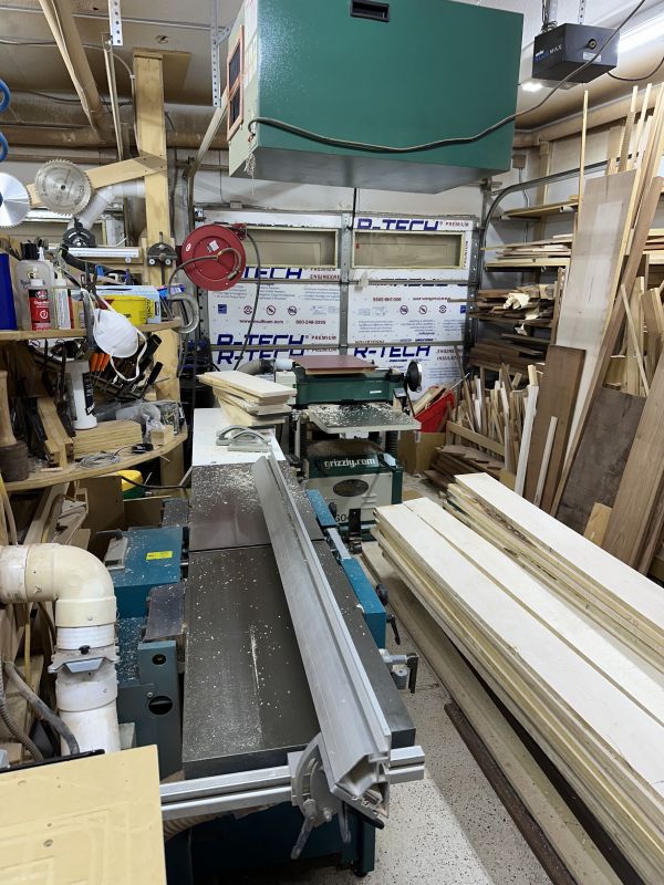 Decided to clear off a spot...donated an un-used MitreBox and saw...that was just sitting around and getting rusty.... Had 2 to send over to the Lutheran's Thrift Store...the area back there in the red circle...needed cleaned off.... Thing with a motor? A Wen Power Planer..about the size of a Stanley #5 Jack plane, and 3 times the weight... Had a stash of Ash planks I was going through, cutting out the bad areas....I sorted through the stacks...found enough to lay out... Imagine the ones laying flat as Drawer Fronts, and the ones standing up on edge as the dividers between the drawers...this gave me a measurement as to how TALL a case I needed to build...20"...then from there, I got a depth of 16" and a width of 24"...roughly... Next, find enough parts that were long enough to make a panel for the top, and 2 panels for the sides.. Cross cut a few for length...and laid out for the top panel.. left stick needed ripped down a bit(Didn't feel like lowering the saw blade just yet) Ripped that extra off, along with the defects along the outside edge...rearrange a few boards...some needed to be jointed.. We have ways... worked my way through, until.. Last edge...then set up for a glue up..(lowered the saw blade, this time) Spread a bead of glue along one edge, rub that edge against the next edge..repeat as needed...1 clamp on top, 2 clamps underneath..let this heavy mess sit a spell... Sorted out enough boards for one of the 20" long/tall sides... These will need cross cut, and the one on top need ripped down a bunch...then repeat for the other side panel... Same here, these need cross cut for length, jointed and maybe one ripped for width.. Plan at the moment...top corners will get through dovetails...and maybe a slight round over...Bottom divider, will be the "bottom" of the case...and sit in a rebate...may add feet of some sort. Maple runners for the drawers to slide on, front "dividers" out of Ash...both the runners and the dividers ( other than the bottom) will be in sliding dovetails...back of case is to be 1/4" plywood, glued and screwed into a rebate along the sides and the underside of the top... Then, build 5 drawers.. Should be fun, stay tuned...