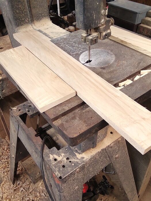 Been ripping and a-cutting on a few planks...and a Project has been started... Some of the parts.. Then a few more parts.. Some other parts needed a little help.. So...we help it out a bit..with a bit of Cardio thrown in.. The goal was to get rid of all the wane, and BIG knots...and fuzzy edges... One plank used to be a 1 x 8 x 6'...took a while...but.. One board was rejected..wonder which one? Had a replacement handy... And..just to make the panel a tad wider... That "small knot"? might get shifted to the outside, and then sawn off.. Other parts.. 5/8" thick Soft Maple for the sides and back of a drawer...Ash for the 3 aprons and a drawer front...which leaves.. Needed for of these...to make tapered legs with...let them sit overnight, then... De-clamped them...set up the rip fence to just skim two faces...one to remove the glue lines, the second one was to skim of a face, to get rid of the "Fuzzies", 90 degrees to the first pass Passes #3 and #4..fence was reset to 1-1/2" width...and the other 2 faces were run through... Will have to trim the ends square..then decide which two faces to cut the tapers on... Until then.. I'll leave then clamped together. Need to joint a few edges... And get these 5 glued up into a top for a table.... Stay tuned..