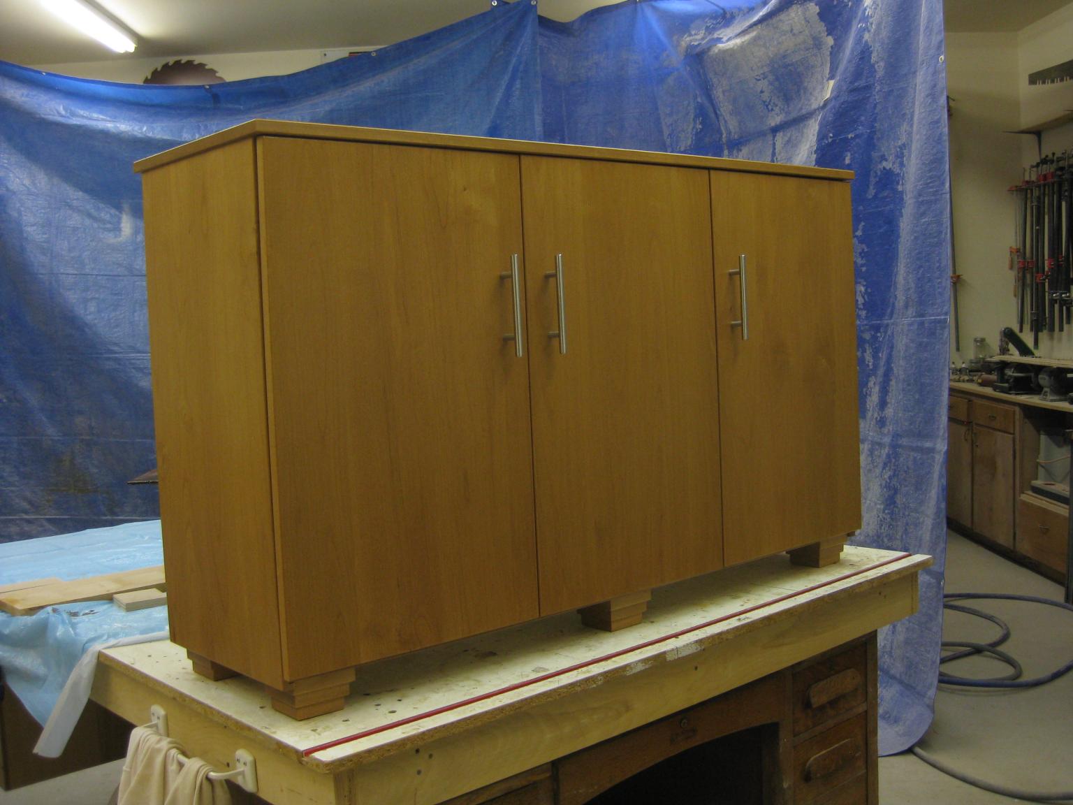 Here's a glimpse at the latest project in my shop. This is a shoe cabinet for a long time client done in a (my first) frameless (almost European) style. Finish is Ipswich Pine (actually had Sherwin Williams make it in their product vs. Minwax) stain with 2 coats semi gloss (for build) and two coats satin. Wood is Alder. Different for me but I like the simplicity, which is what she wanted. Hope she likes it.