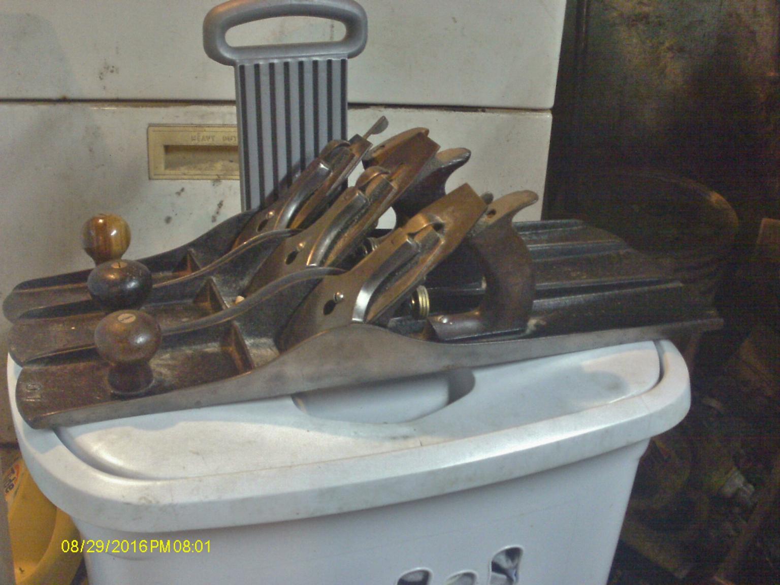 All the sanding dust had to go somewhere, but why on my planes? After I finished a glue up, I gave a few a wipe down.. Yep, that is a clothes dryer back there, and they are sitting on a hamper. I have to share space with the Laundry room. Front to rear: Ohio Tool Co. No. 0-7 ( smooth sole) and a pair of Stanley No. 7c, type 9 jointers. The one in back has "loaner" handles, until I can afford the Rosewood ones. The other jointer in the shop.. Is what Stanley called a Small Jointer.....No.6c, type 10. Lot of weight here, so I had better put them away, until needed. The 0-7 is marked on the toe of the plane, the rest have theirs on the rear porch.. I seem to recall Ohio using mahogany for their handles, Stanley at this time was using Rosewood. Just a look at the shop's cordless jointers...