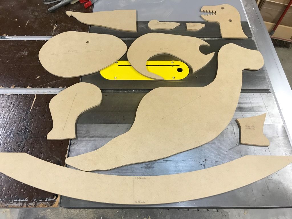 The kitchen side chairs had to take a back burner. My granddaughter has her 1st birthday this month. My present to her is Rita – the rocking Dinosaur. The inspiration for this rocking animal was from a book authored by Jeff Miller, entitle “Children’s Furniture Projects”. I did take much latitude to designing and construction. I scanned Jeff’s drawing into a JPG formatted file and then imported into Sketchup. Using Sketchup, I drew over the imported image, created a 3D model, and resized the model to suit my needs. Flat patterns were then printed in 1:1 scale. The paper patterns were glued to clear shelving paper using 3M spray adhesive onto ¼” MDF to develop 10 individual templates. Using the templates the dinosaur body was cut-out from ½”, 3/8”, and ¼” Baltic birch plywood. The main body has 5 pieces. Total part count is 52 pieces. The rocking runners were made from eleven, per side, 0.120’”hard maple pieces. The maple was bent formed using a MDF form and UNIBOND 1 adhesive. I like to trim the runners using a tall fence on the table saw. A safe way to doom the end of the ¾” dowel used for the handle, is to use a router table set-up. Some assembly required. The different subassemblies were glued and screwed together. Shown here are the 3 different inner main body pieces. Notice that the middle pieces are hollow. Similar for the flank subassembly. Because the main construction material was plywood, I glued in hardwood dowels in each attachment point and trimmed to fit. I introduce to you, RITA! Happy, birthday girl
