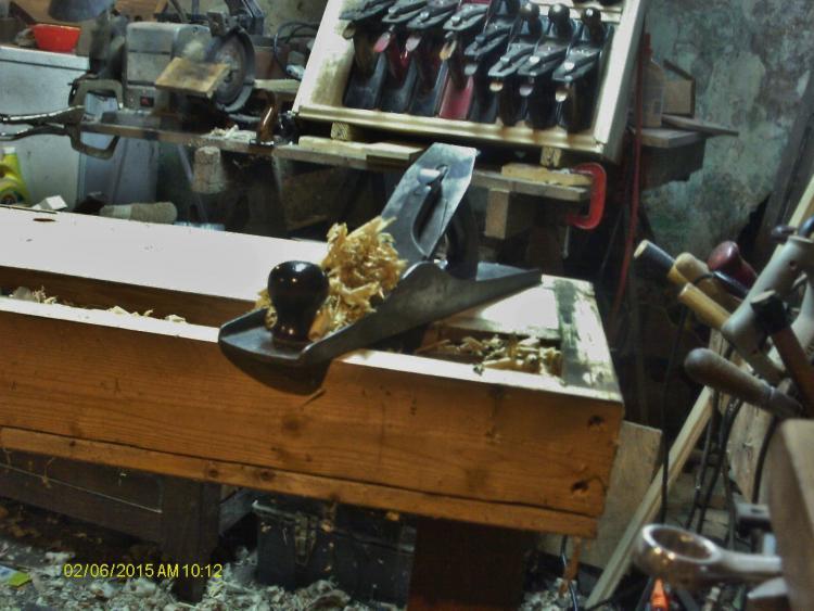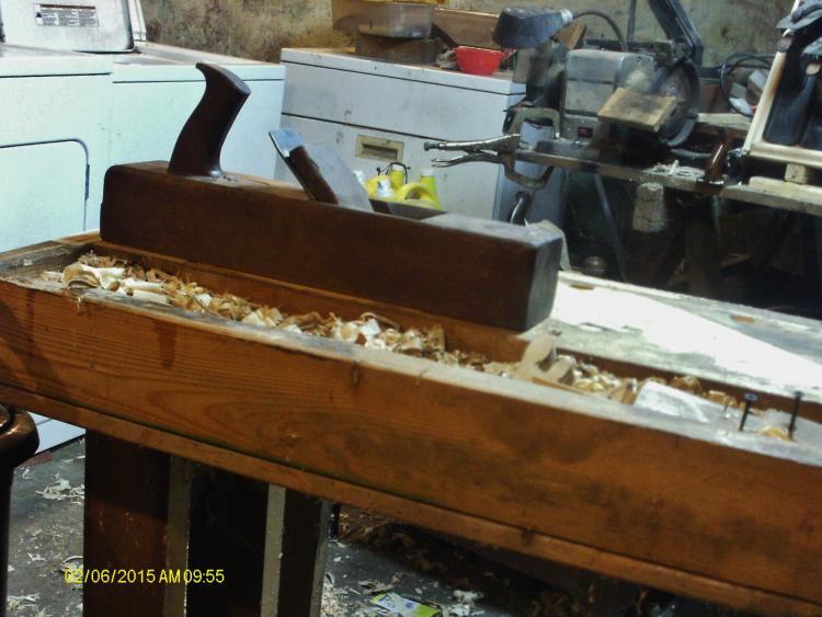 After drilling a few holes in the work bench's top for those B&D Workamate dogs......got to looking AT the bench's top a bit...... After over a year of use, and abuse, it was starting to look a little bedraggled. Pine top had "moved" a bit, was in dire need of a clean up. Cleared all the stuff off the bench, that took awhile, right there! Then grbbed a few wood bodied fore planes,,, Had to drag the bench out away from other things, got tired of the planes hitting things. Went at the top at a diagonal to the grain. Even had some end grain to plane down, as the legs go all the way through the top. Used a 22" long try plane as well. Then, once the top was cleaned off and almost flat, got out the iron bodied small jointer plane And level the "Playing Field" a bit. had a few scallopped areas that needed smoothed over, so...a smooth plane was used a bit Now, since all that bare wood was shinning up, and a cup of that SMELLY BLO stuff was handy..... Gave things a decent coat. I also drilled two more dog holes. Still debating about a second row of them.... Dryer "BUZZED" as the clothes were dry. Loaded them up, and went upstairs. That way, I don't have to smell the finish drying.... Bench might be good for another year or so???