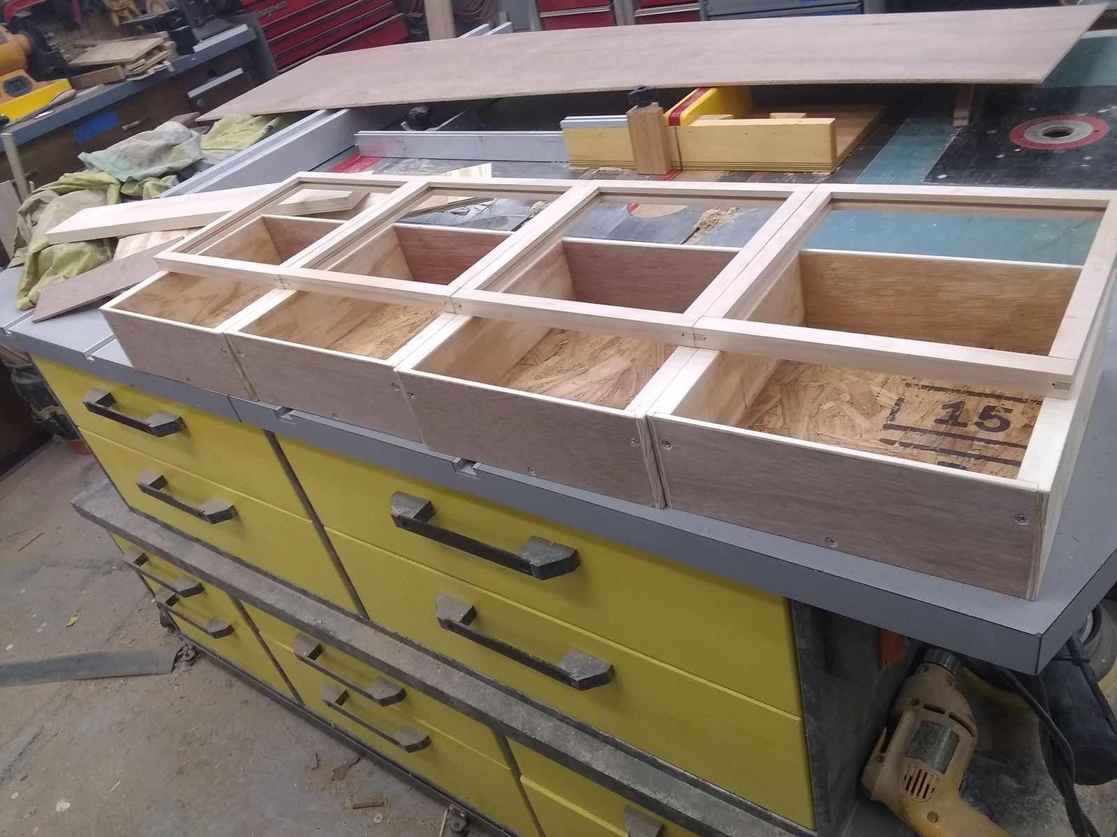 In my quest to keep things organized and put where I can see and get to them easily I turned to a area that is open cabinets above the two windows in my shop. The lights have been upgraded so I can see well, now I am ready to organize / get rid of stuff / add more stuff, to this area. In place are some boxes someone gave me to burn. They were to big so I resized them and made them work for the time being. So now I want better boxes, that lock so when I get on the ladder and bring them down stuff doesn't go everywhere. (Yes it has happened, you know it did) A recent email from someone complained that everything we make is good but who has that kind of money to make stuff. I told them even BC grade plywood can make nice things with some effort. The reply made me chuckle, prove it. Okay, challenge accepted. For the front and back I am using 3/4 inch BC plywood, for the sides 1/4 plywood, for the bottom 1/2 OSB. The tops will be made from shorts of pine I cobbled together and some plywood. No hardwoods, will be creative with the finish on each one just to show how lesser grade wood finishes. First thing to do is rough cut my plywood pieces down to size and edge band them with some thin scrap from a short piece of 2x4 stud. It's pine and cheap. Finished these 1/4 pieces and let cure overnight. With the edge banding done I sanded them flat, just needed a few passes with 120 grit to flush the entire edge good. Now work can begin on the boxes. Took me about an hour to cut all the pieces, used a rabbit joint for the front to sides. Looking for dovetails? See @steven newman I glued this but because I have heavy things planned to go inside these I added some screws to the mix. Considering the material being used probably a good idea, or overkill you call it. Cut down some scrap 3/4 pine I had and made the tops. Lap jointed these, took awhile to set the cuts up and do all 16 pieces and check for dry fit. End of day now got the boxes glued up and the tops dry fitted. I will cut the plywood inserts for them tomorrow and glue them up. The bottoms? Yes I did use the OSB as promised. Also glued and screwed, can't be too careful. That is a wrap for this evening.