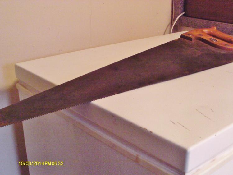 Yard sale had a bucket for sale @ $10, well they had three of them. One though, stood out from the others. Seems that sticking up out of that bucket was a 36" long, two-handed screwdriver. And a Disston saw. The rest of the "goodies down below? WS Backsaw, a Germany H.S.#102 brace ( 10" sweep) five more screwdrivers, three wire brushes, the frame for a Stanley 295 sureform file, three gear pullers, a 10" Ridgid pipe wrench (ah, ain't he cute) and that 5 gallon bucket! A look inside the bucket Plus that Disston saw that was sticking up? 26" straight back, 8ppi crosscut, with a full etch. Handle looked a little weird and the medallion does says Warranted Superior. The etch says it is a "National Hardware Special" with Disston in big block letters over a keystone. Below that is a double scrolled line with 1840 Philadelphia 1940 between the lines Saw was made for a trade show in 1954. The next year HK Porter bought out Disston. Worth the ten spot?