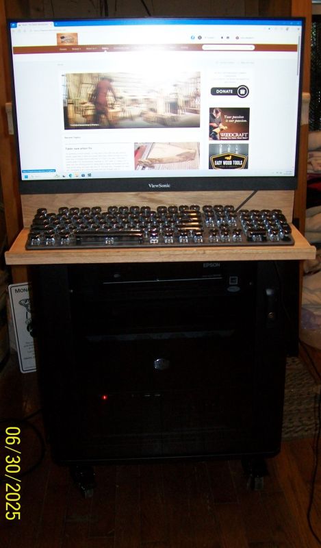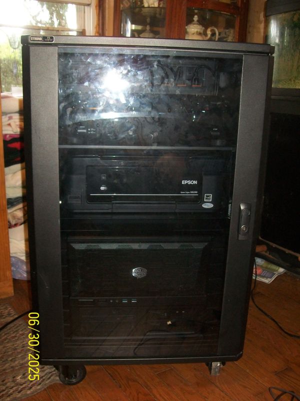 This adventure started with my neighbor Bruce finding an enclosed server cabinet. He also got a pair of seven foot tall four poster open frame server racks but I snagged this much smaller Strong FS Series 15U enclosed cabinet. I've got my dual-boot Windows 11/Zorin OS (Linux) in a Cooler Master HAF XB case, an Epson All-In-One Printer on a slide out drawer, and an Ion Profile LP Turntable mounted inside the cabinet but needed to also fit a monitor.\ Doesn't look like one will fit. This is the top of the cabinet. I'll be installing two 12 Volt DC 120mm Cooler Master computer case fans in place of the two 120 Volt AC fans that were in the cabinet. They were just too loud for both SWMBO and me. Since the 22" Viewsonic monitor won't fit inside the cabinet we'll just add to the cabinet. Yeah Right! Houston "We have a few problems". First off if I mount the monitor on top of the cabinet it's too high for comfortable "Couch Surfing" so I rummaged through those boxes of tangled cables etc. over in Bruces shed. Managed to find a few goodies including this TV/Monitor wall mount. This will allow the monitor to hang off the front of the cabinet putting it into a much more comfortable position for viewing. Only problem with that is the wall mount would have to mount in the fan openings. So after a bit of & I decided I needed to build a raised bottom that would allow me to mount the wall mount without interfering with the fans. But after looking around I repurposed the base from that last computer case build that SWMBO decided she wanted for its original purpose as a sewing desk. All I had to do was cut ~1/2" off of both sides then add it back with a lip to fit over the server cabinet so it wouldn't slide around. The front to back was the perfect size so I only needed to add the lips to the front and back with a space in the back edge for fan airflow. After the base was set in place I mounted the monitor. I also built a keyboard, and Bluetooth Speaker bar trays/shelves, but I'll have to go into detail on those later. SWMBO's asking if I'm about done. But before I go, here's a view of the new setup on the Wonderful WWW. Anybody recognize the website? -