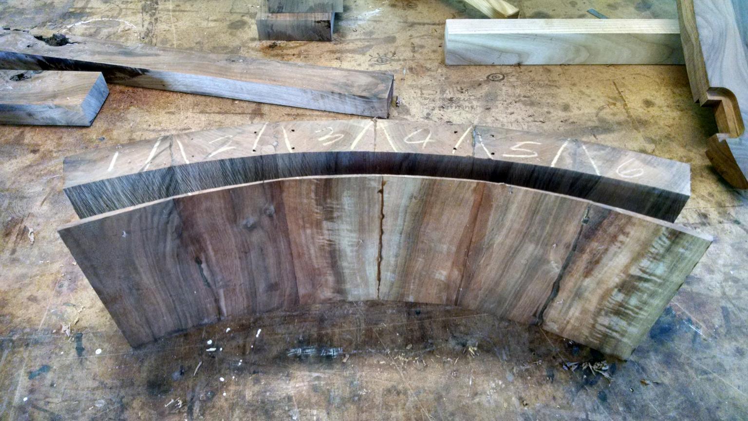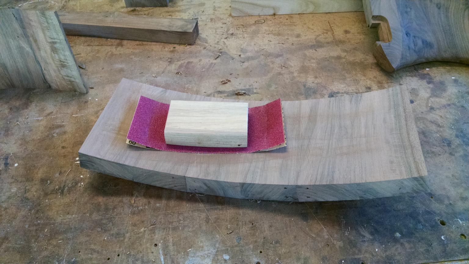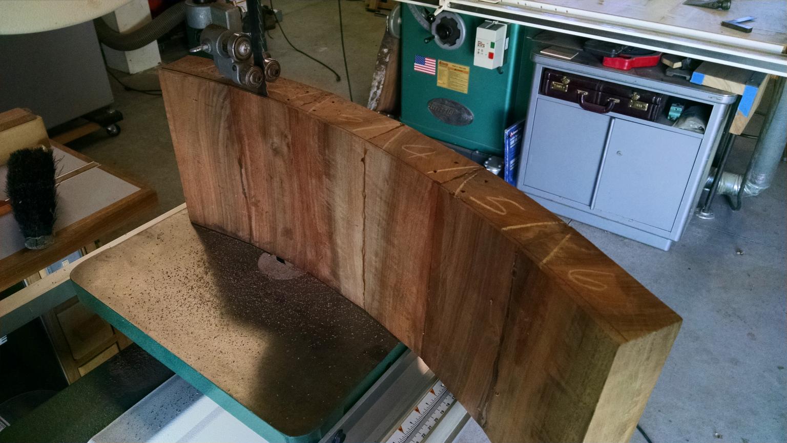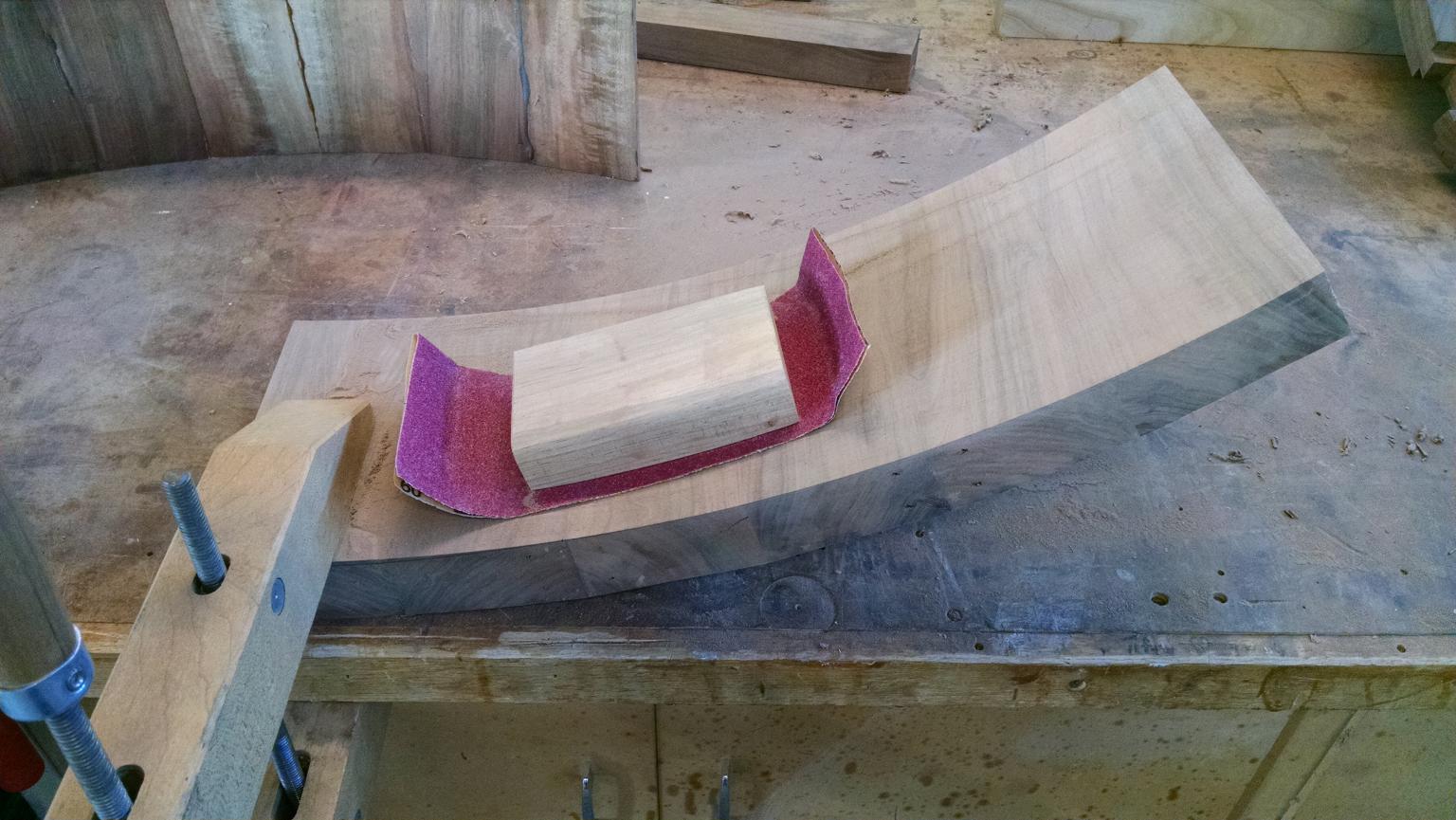 Today I started on the final shaping on the headrest for the rocker. Photo below is the roughed out coopered headrest. I had to plane down the glue squeeze out because the next step is to joint one end of the headrest and I need a relatively unobstructed surface to ride against the joiner fence. There, all clean now. Now that one side is cleaned up pretty good I made one end of the headrest nice and flat for a good reference surface for the band-saw operation. One end is nice and clean now. I traced a nice arc on the rough end with my pattern I use for all the rocker headrests. Remember I need the clean end to ride on the band saw table. I hung my 3/4" 3 TPI re-saw blade on my 14" band-saw with riser-block. And I cut on the pattern line. My band saw is well tuned, it has to be in order to make cuts like this. I am however looking for a set of new guides, these are a tad worn. But they seem to be holding up fair for now. I can saw veneers with my 14" Grizzly Bandsaw, it's a good saw. With my sanding block sawed and shaped to the same radius as my headrest, I need to sand the lumps out by hand and also level the surface, this is a long process, it typically takes about a half hour or more to get this arc nice and smooth with zero imperfections and lumps. I use 60 grit for this process. I can get a ton of leverage when I clamp it up to my bench and I am able to exert body weight down onto the surface. Thanks for following along!