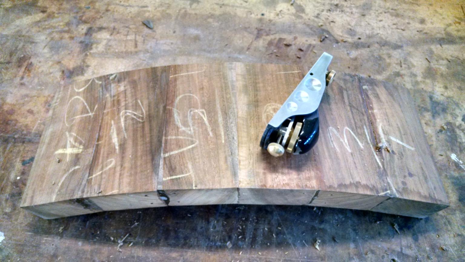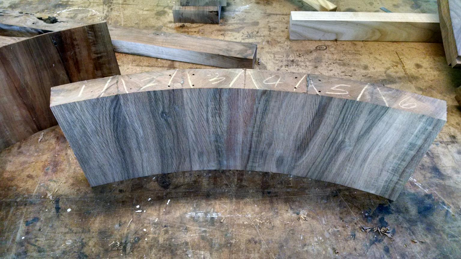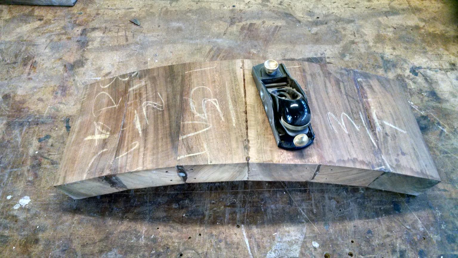 Today I started on the final shaping on the headrest for the rocker. Photo below is the roughed out coopered headrest. I had to plane down the glue squeeze out because the next step is to joint one end of the headrest and I need a relatively unobstructed surface to ride against the joiner fence. There, all clean now. Now that one side is cleaned up pretty good I made one end of the headrest nice and flat for a good reference surface for the band-saw operation. One end is nice and clean now. I traced a nice arc on the rough end with my pattern I use for all the rocker headrests. Remember I need the clean end to ride on the band saw table. I hung my 3/4" 3 TPI re-saw blade on my 14" band-saw with riser-block. And I cut on the pattern line. My band saw is well tuned, it has to be in order to make cuts like this. I am however looking for a set of new guides, these are a tad worn. But they seem to be holding up fair for now. I can saw veneers with my 14" Grizzly Bandsaw, it's a good saw. With my sanding block sawed and shaped to the same radius as my headrest, I need to sand the lumps out by hand and also level the surface, this is a long process, it typically takes about a half hour or more to get this arc nice and smooth with zero imperfections and lumps. I use 60 grit for this process. I can get a ton of leverage when I clamp it up to my bench and I am able to exert body weight down onto the surface. Thanks for following along!