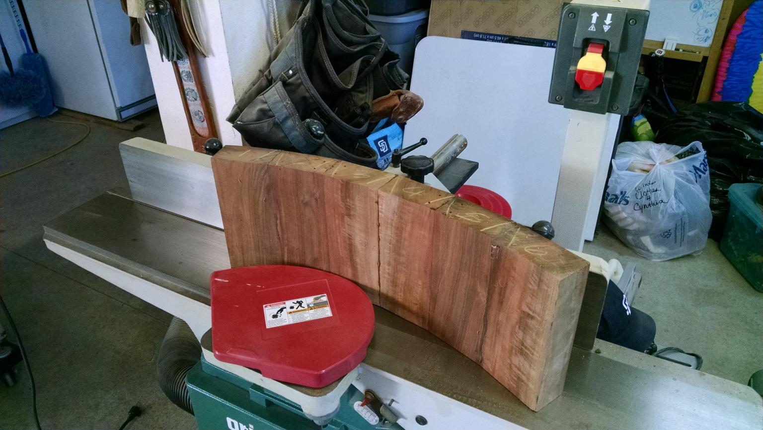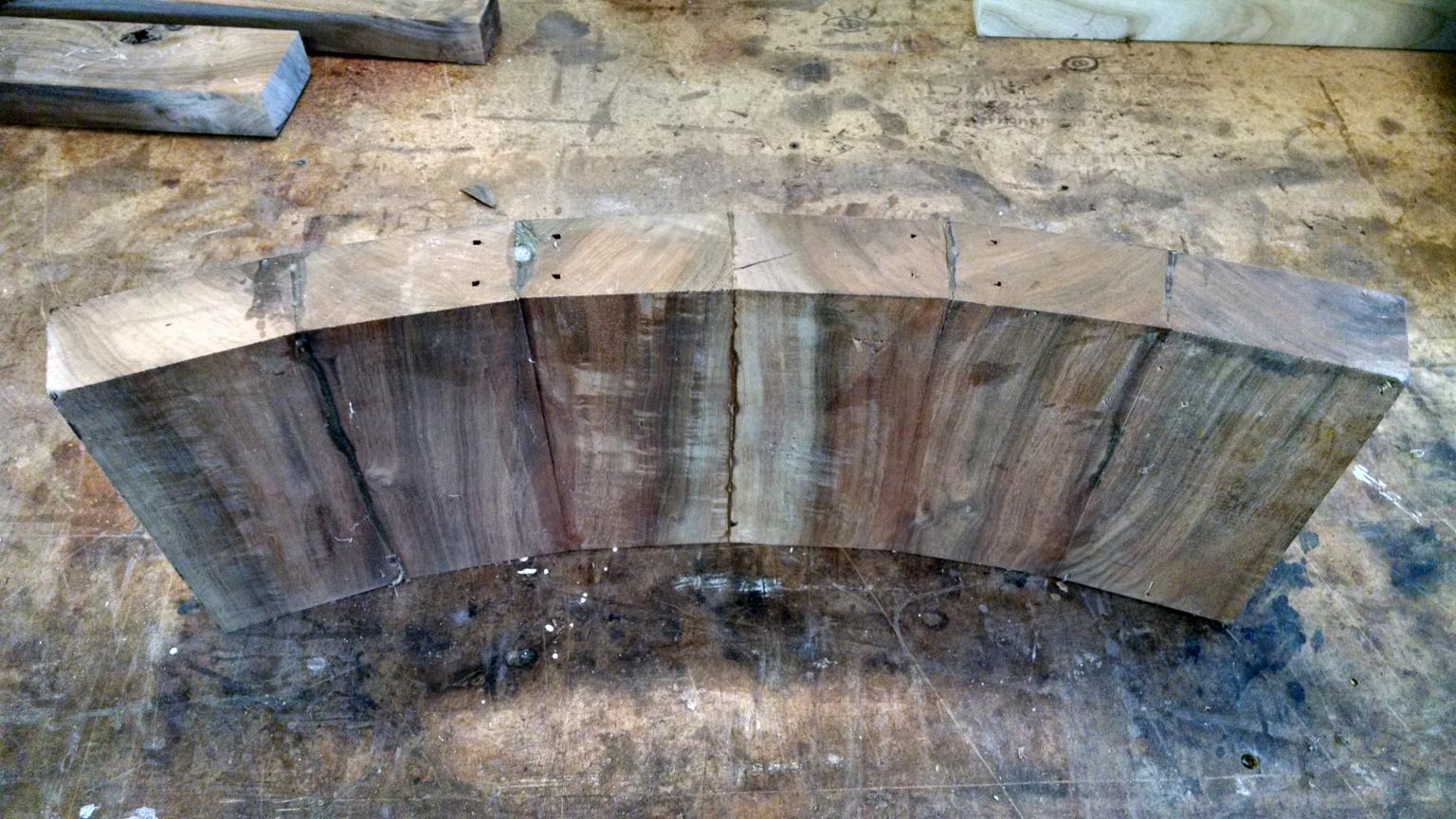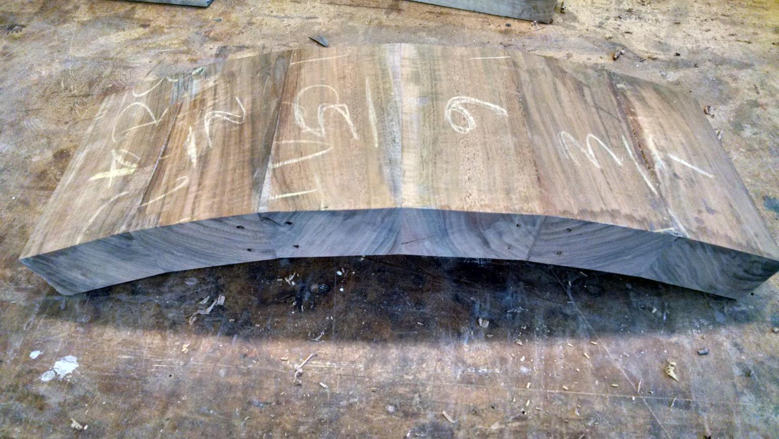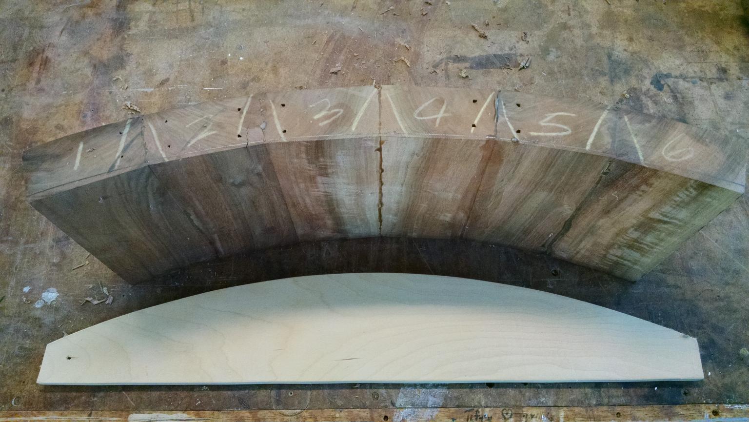 Today I started on the final shaping on the headrest for the rocker. Photo below is the roughed out coopered headrest. I had to plane down the glue squeeze out because the next step is to joint one end of the headrest and I need a relatively unobstructed surface to ride against the joiner fence. There, all clean now. Now that one side is cleaned up pretty good I made one end of the headrest nice and flat for a good reference surface for the band-saw operation. One end is nice and clean now. I traced a nice arc on the rough end with my pattern I use for all the rocker headrests. Remember I need the clean end to ride on the band saw table. I hung my 3/4" 3 TPI re-saw blade on my 14" band-saw with riser-block. And I cut on the pattern line. My band saw is well tuned, it has to be in order to make cuts like this. I am however looking for a set of new guides, these are a tad worn. But they seem to be holding up fair for now. I can saw veneers with my 14" Grizzly Bandsaw, it's a good saw. With my sanding block sawed and shaped to the same radius as my headrest, I need to sand the lumps out by hand and also level the surface, this is a long process, it typically takes about a half hour or more to get this arc nice and smooth with zero imperfections and lumps. I use 60 grit for this process. I can get a ton of leverage when I clamp it up to my bench and I am able to exert body weight down onto the surface. Thanks for following along!