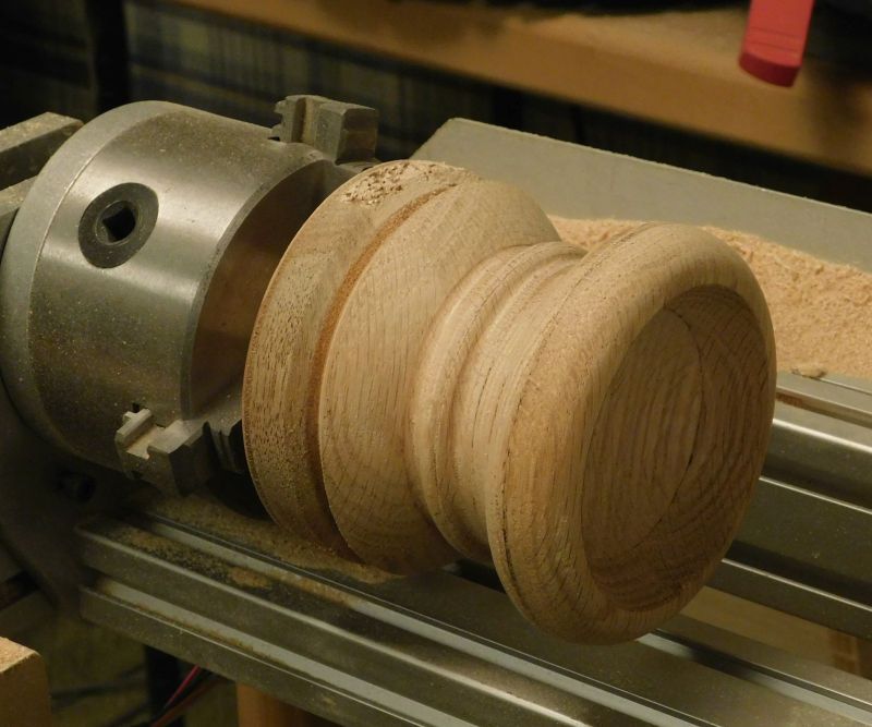 This is a coin/key cup. One example of a project I used to have my students make on our lathes. Found this oak block already glued up and assume I made it 5 or six years back intending to show my student as an example that could be cut using the CNC rather than the lathes. No better time than now to actually cut it. Pushed the limits of my CNC. I had to set the Z clearance down to 1/16" so the bits I used would start above the wood blank. 4" diameter, 3" tall. Glued to a plywood scrap with paper in between so I can split it off cleanly with no screw holes in the bottom. The bowl center I did with the block standing up and a typical moulding toolpath. The contoured perimeter is all done here on the rotary axis. Shot taken just as it finished being cut. I'll take it out to my garage lathe to sand clean and down to 300 grit. 4D