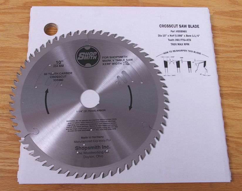Yesterday son and I made some Pull Out Shelving for mama, see proceeding link. And while cutting down the panel for the shelves, we had to do some cross cutting of ply on my Shopsmith. I was pleasantly, actually, very very happy, to see the quality of cut that was produced on the smith with the blade I used. Also this cut was made without a zero clearance insert, I just had on the factory insert, and the quality was perfect, I was very impressed. I don't remember getting this good a cut even on my 12" 5hp Grizz cabinet saw using an 80 tooth Amana Blue melamine blade. I am not sure what happened here, but really, I was not expecting such a great cut, so there are several factors in play here. And I'll list them. Quality of ply, the ply we are using is excellent, prefinished maple ply Made in the USA. Just great stuff. So the finish is binding the maple veneer which may be preventing tear out. Shopsmith 60 tooth 10" blade The variable speed on my smith, I had it set at "R" or 3500 RPM, (not sure if that is arbor speed or tooth speed) Given that, I am sure the factors created a concert for a perfect cut, I'll have to test the cut on some less desirable ply, and see if that makes a difference. But boy was I happy. Again, no zero clearance insert here. Something really cool about the smith, is the variable speed, so I could have done some test cuts, and played with the speed a little to get the best cut, but in this case the first cut was perfect. I just used the Shopsmith speed chart, they did not list ply in the chart, so I chose the setting for softwood thinking ply is equivalent possibly to soft wood. My Shopsmith keeps giving me surprises like this frequently, just when I think I have pushed the limits of the smith, something like this happens, and it just makes me feel better about giving up my dedicated machinery as I had, and the smith in its place. I am not advocating the idea that the smith can take the place of dedicated machinery, I don't wholly agree with that, machinery made for a specific use is going to be much better and more efficient, typically, but for those who are considering a Shopsmith in order to save space, or you moved to more confined quarters, or just to add one to your arsenal of machinery, the cut quality on ply, may not have to be a concern during your deliberations. That being said, for my use, and my tight quarters (car in garage at night) I could not imagine another machine in my shop, or needing another machine, I have had this machine for two years now, while I needed to adjust my brain around it, and the sequence of work, yes there was an adjustment period, and a honeymoon period, and a disappointment period that was due mainly to my own ignorance on how the machine works, and its capabilities. But at this time after using it for two years, and learning its operations, I am happy. And it keeps surprising me, pleasantly. Image below is the top side of the cut Image below is the underside of the cut I used this Shopsmith 1 1/4" arbor 60 tooth cross cut blade. The blade below is from their website, but I used this exact same one.