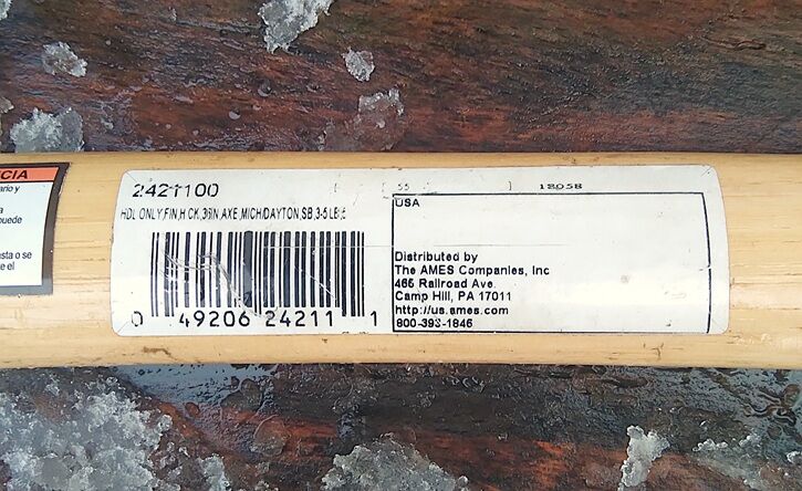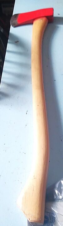 Well, this one has been sitting outside a while... Was "picked " a few years ago at a garage sale for $2 I think....OEM Handle was trashed, and cracked...so, spent $15 or so on a new handle for it right after I bought the Ax... Been staying outside...decided to bring it in for the winter...clean it up (again)..sharpen the edge a bit better.. 36" handle.. Still has it's Bar Code.... Ax Head is known as a Dayton Pattern....I cleaned all the rust off, gave the bare metal a coat of Red Rustoleum/Primer....then worked on the edge a bit.. Can't shave with it...yet...but it is close to it's little Brother... This one stays IN the shop...and, you can shave arm hair with it...