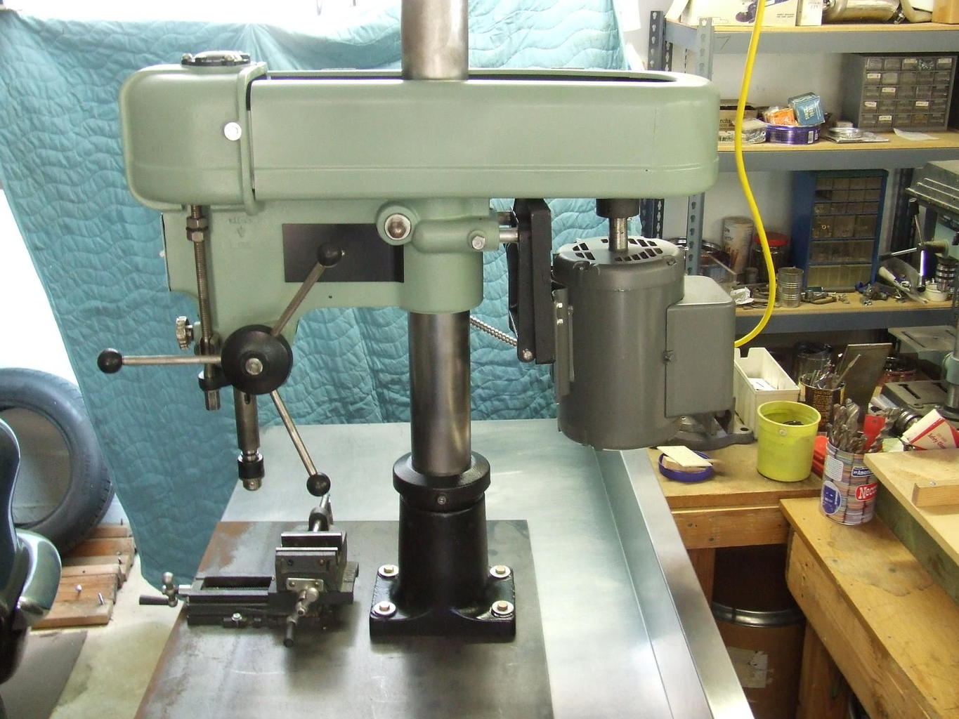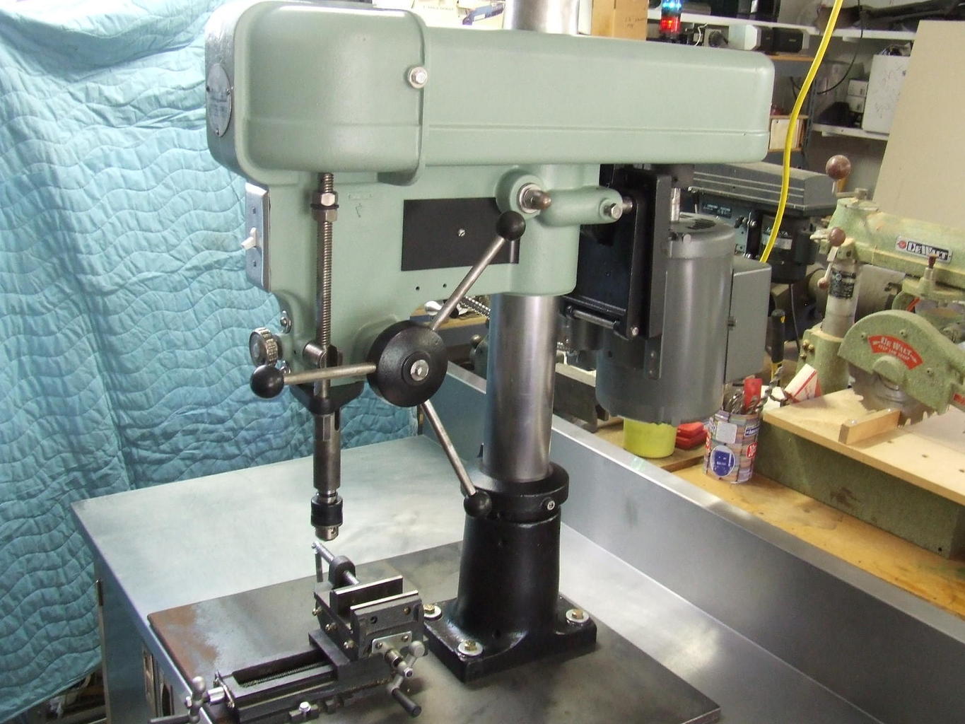 Restoring a Walker Turner (Rockwell) 20" Drill Press Model 70-400 Model Number: Labeled 70-400 but actually a 70-410 because it is has an MT3 taper Type: Drill Head Only Serial Number: 1350495 (1964) Spindle Size: MT3 Power Feed: No Slow Speed: No Number Of Belts: 1 Date of Restoration: June to August 2018 The previous owner installed a single phase 120VAC motor from a Jet drill. He also gave me the motor that was installed when he bought it, but I dont think it is an original WT motor. It is 3 phase but has no label. I installed a Baldor 3HP single phase 120VAC motor (because I like big motors). I dont have 3 phase service, but I am in the process of building a rotary phase converter. I will be restoring a Powermatic 1150 drill press in the future. A few years ago I restored a DeWalt table saw. It still works great. To disassemble the drill: 1. Start disassembly: Remove the chuck Remove the belt cover Release the belt tension Slip the belt off the motor pulley Remove the large handle that raises and lowers the chuck NOTE: I tried to remove one of the 3 arms and ended up damaging it with a pipe wrench. It refused to come out. The 3 black balls came off easily. Remove both side plates (Where the power feed would be attached) Remove on/off switch assembly Remove the left 2 bolts holding the motor to the motor bracket (You cant get to them after the drill is layed on its left side) Ensure the bottom collar is clamped tighly onto the column (To prevent head from falling to the bottom of the column) Remove the huge nut on the right side that clamps the head to the column Remove the lever that raises and lowers the head Remove the assembly that the lever is attached to (4 bolts) Tighten bolt so the head will not swivel 2. Continue disassembly: Lay drill on its left side Remove motor Remove motor bracket from head (1 bolt) Remove column base Slide column out of head 3. Prepare to remove the quill: Remove chuck depth adjusting bolt Remove front knob, assembly, and set screw (This holds the chuck in position) Use a magnet to remove the inner piece Use a flatblade to remove the 2 large screws on the front Use a flatblade to remove the 2 inner pieces Use a magnet to remove 2 more inner pieces 4. Remove the quill: Remove the top head cap (3 bolts) (This might be difficult. Be careful not to break it.) Remove the belt Loosen the set screw on the pulley DANGER: The quill might fall out of the head when the next 2 steps are performed. NOTE: The large spring that holds the quill up will uncoil on the next step. Remove the large lever and assembly that raises and lowers the chuck Pull the gear shaft out of the head Remove the quill and spindle (You may need to knock it out from the top with a piece of wood) (The pulley will not move. Only the shaft will come out) 5. Remove the 2 quill bearings: Remove the spacer from the spindle (2 set screws) Remove the spindle from the quill using a piece of wood and a big a** vise opened at the correct width so the shaft will slip out of the quill and bearing assembly (This is difficult. It takes a lot of force. Place the piece of wood on top of the shaft, on the spline end, and hit the wood with a BIG hammer. The 2 bearings should remain inside the quill) Beat the 2 bearings out of the quill with a brass rod 6. Remove the pulley assembly from the head: Use a long piece of wood (12" long) to knock the pulley assembly out of the head (Place the wood piece in the area where the quill was located. Mark the wood piece before you hit it, to indicate how much it moves. This is difficult. It takes a lot of force to knock the bearing cap out of the head.) NOTE: This pulley assembly consists of a bearing sitting on top of the pulley, and a bearing and cap on the bottom of the pulley. The previous step should have knocked the cap out of the head, thus enabling the entire assembly to be removed. The outside diameter of this cap is approximately 2 1/2".) 7. Remove the 2 pulley bearings: Use a vise to press the inner sleeve in both directions to remove the top and bottom pulley bearings 8. Clean it and paint it: Use a wire brush head (one on a drill and one on a bench grinder) to remove the old paint Use a Dremel to remove the old paint around the 2 badges Paint it. I used Rustoleum Satin Sage spray paint 9. I cant find a parts manual for the 70-400 20" drill. But I believe the later 1100 20" drills use most of the same parts. My drill press had these 4 bearings: Bearing on top of pulley: Norma 205PP - Same as SKF 6205ZZ Bearing just below pulley: Norma 205PP - Same as SKF 6205ZZ Bearing inside top of quill: MRC 204SF - Same as SKF 6204Z Bearing inside bottom of quill: SKF 170372 (1-70372) 10. Cost: 70-400 Used from craigslist.........................................$250.00 I bought these 3 parts in June 2018 from wtsmllc@juno.com (The Walker Turner Serviced Machinery LLC) (These 3 parts arent sold anywhere else that I know of) P/N 70372 Double Row RBI Sealed - Special Bore Double Sealed.......$ 64.95 P/N 80857 Spacer (required for above bearing)......................$ 2.50 P/N 3600 V-Belt standard direct drive 5-speed pulley config 61.5"..$ 23.50 S&H USA.............................................................$ 7.40 Total for above 3 items.............................................$ 98.35 3 Bearings 6204ZZ 6205ZZ 6205ZZ (from popular auction website)......$ 25.95 Paint (Rustoleum Satin Sage)........................................$ 31.20 New Baldor 3HP motor from craigslist................................$150.00 Grand Total.........................................................$653.85 Was it worth all the work? You bet! -