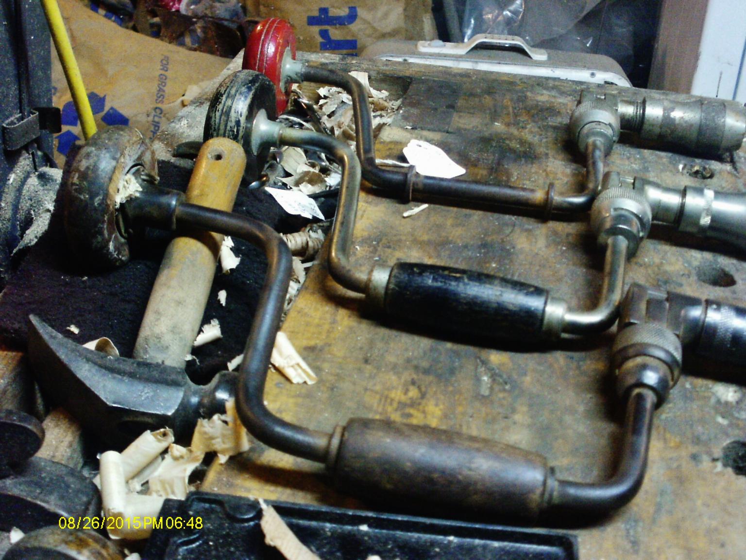 Seems he went downtown tonight....just to get some chinese takeout to eat....Apparently had to wait on it.....a certain store is right next door..... This is what he brought back..besides the fried rice and shrimp About $7-$8 a piece. One handle was MIA, and a knob was in need of a bit of work.. Cleaned the chucks off Hmmm, the one in front has Millers Falls Co. stamped all around the chuck. Seems to have been "Blued" at one time? The other two are clones of each other, haven't found a name on either..yet The missing handle I'll fix later. Involves some fancy glueing and drilling, and some spokeshave work....not tonight. As for that ugly knob? LOL...take your pick. Anyway, them nails just had to go. Pulled them, and found a strip of packing tape inside...it was tossed as well. Oil on some moving parts, found some small screws, and some fresh wood to screw into... it might just work.. A wipe on of BLO on the wood. Ratchet works now, and is oiled up. Couple of the others are also oiled up in the moving parts. Maybe a day or two, I might make a handle for that other one. Then paint it RED. Somebody trained my Grandson right....