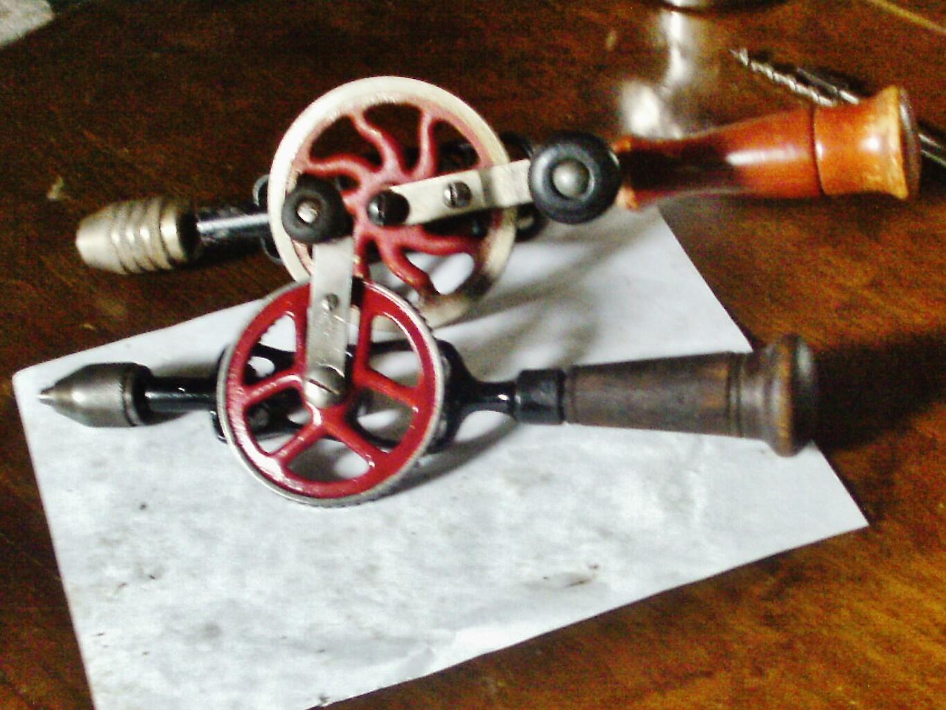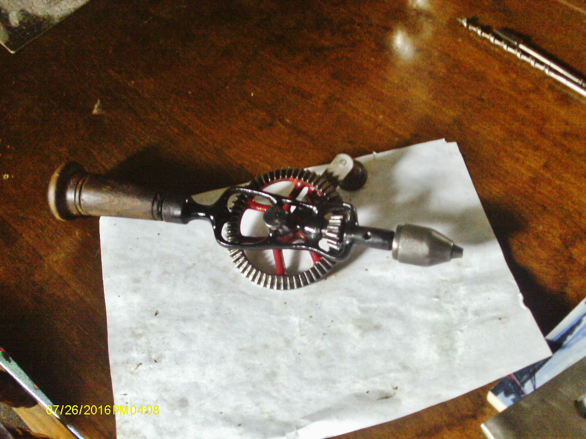 Well, a part of the haul that came home with the tool box, was a little eggbeater drill... Lovely, ain't it? Well, after cleaning all the other items inside that box, and putting them away, I could finally start on a rehab of this eggbeater drill....drum roll, if you please.. Look any better? Name that was stamped into the handle? Granlt Tool Comp. New York Germany Not sure who actually made the drill. The cap on the handle was glued in place long ago. Handle just threads onto the end of the frame. Three jaw chuck. Drill has a single gear. Frame is shaped like a milk bottle? I re-painted the frame a Rustoleum black, and the spokes of the drive gear a red colour. All moving parts were oiled up. The wood parts were wiped off, and then a coat of 3in1oil added. Most of the clean up was by a wire wheel. Set a Millers Falls No. 2-01 beside this little drill.. Mutt & Jeff? The little guy was never drilled or tapped for a side handle.. I suppose one could drill and tap a small hole, to mount a side handle, IF they wanted one. I don't really think this one needs it. Drill was $3, at s yard sale...the only old tool she had. Might make some use out of it....